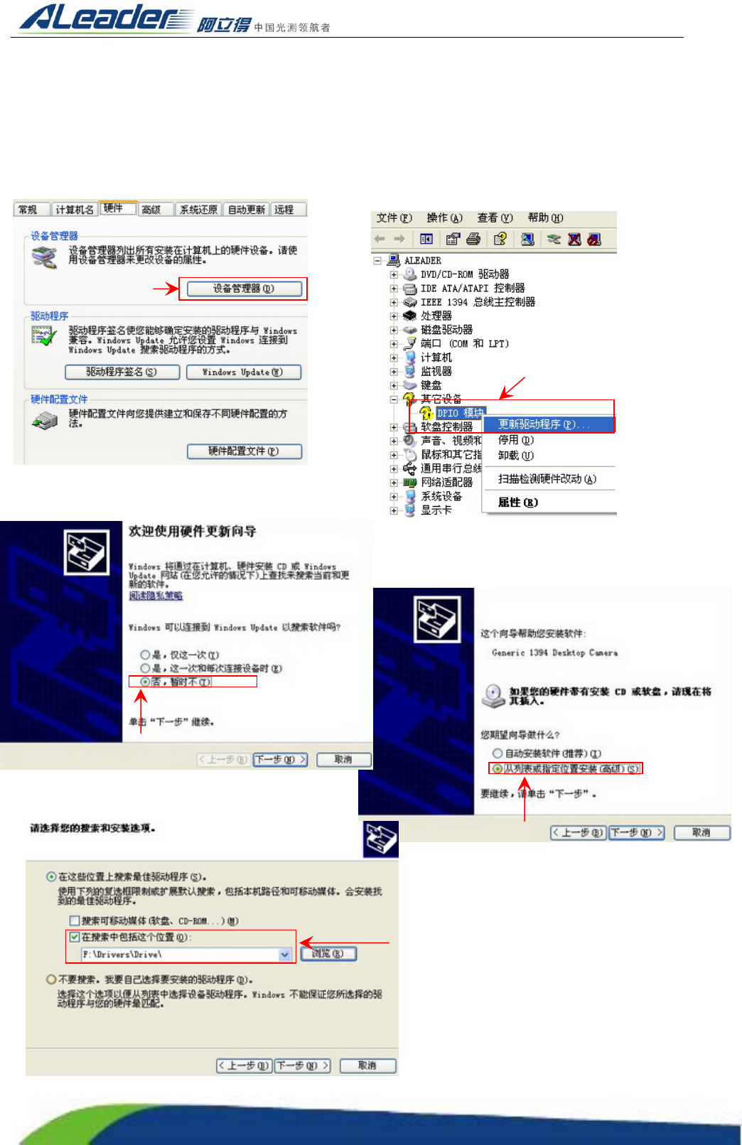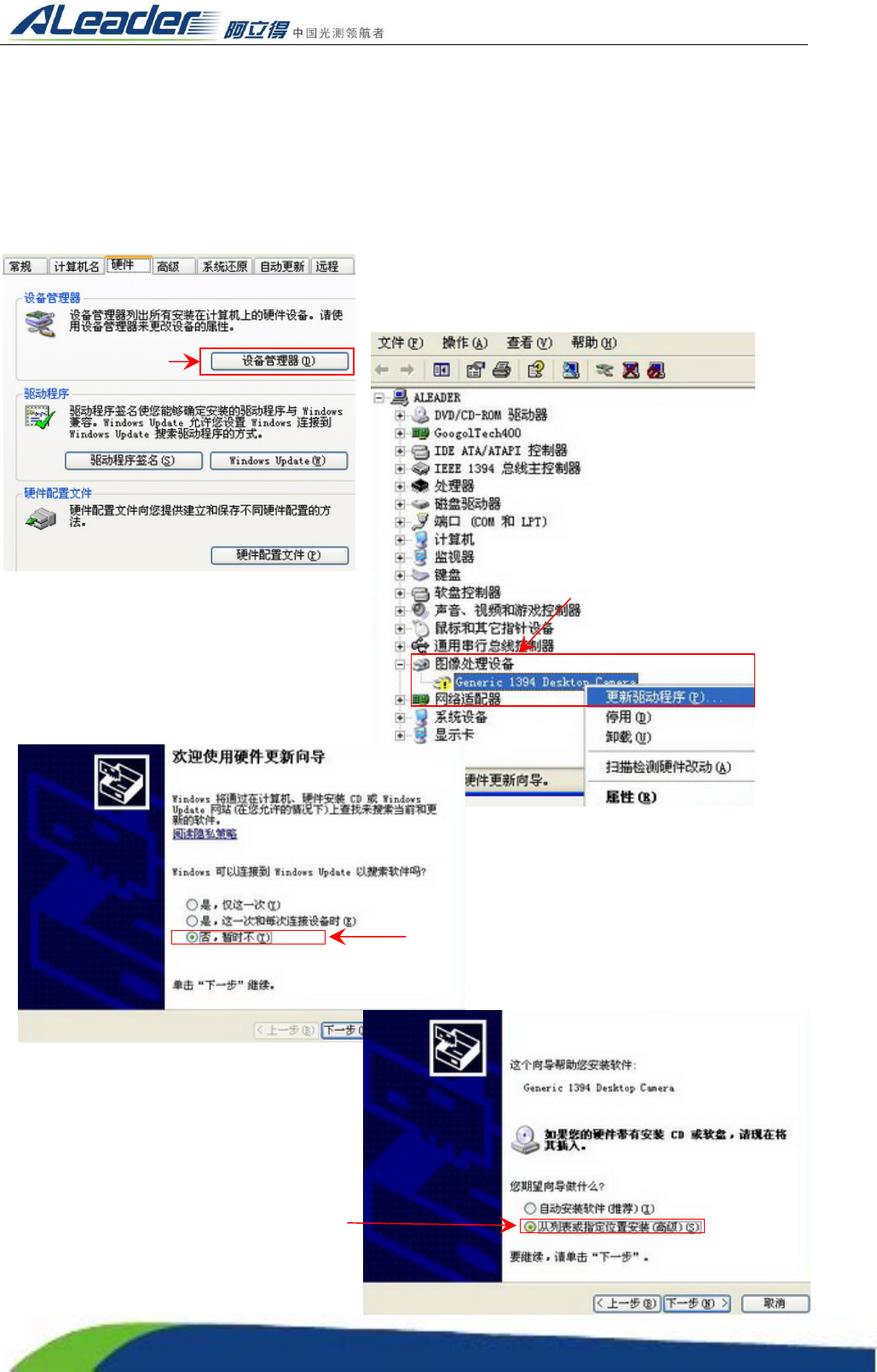 Http:www.aoichina.c om TEL:0769-22620377 2262 0877 FAX:0769-23102060 Page:21 of 11 5 2.12.1 图像卡的驱动安装 选择“我的电脑”→鼠标右键选择“属性”→选择“硬件选项卡”栏下的“设备管理器”→从列表中 选择 “ Generic 1394 Desktop Camera ” →鼠标右键选择 “更新驱动程序” →选择 (否, 暂时不) 进行下 一步→选择…