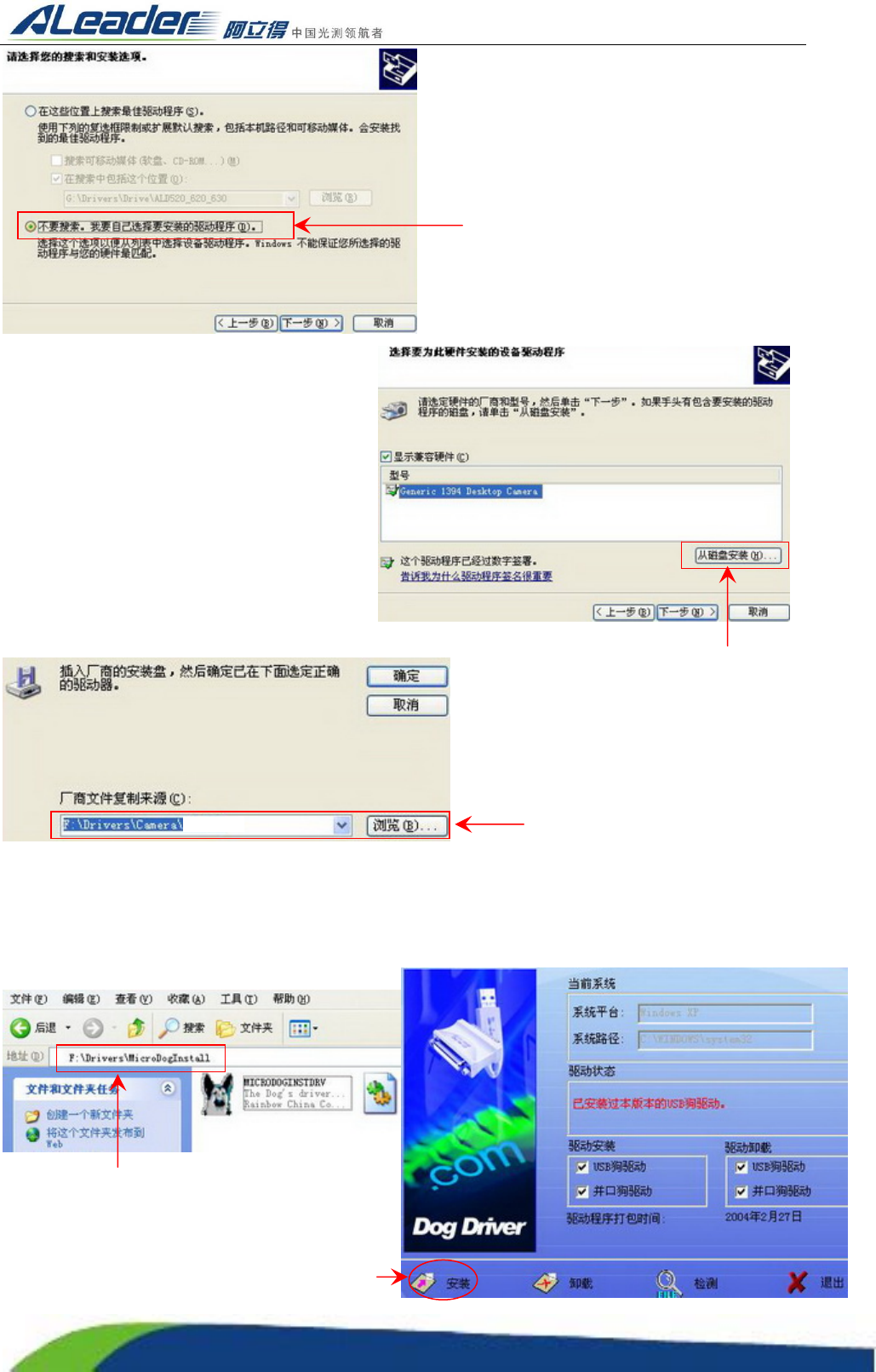 运行 Aleader 维护光盘→选择 Browse CD→选择 Drivers 文件夹→选择 MicroDogInstall 文件夹→运行