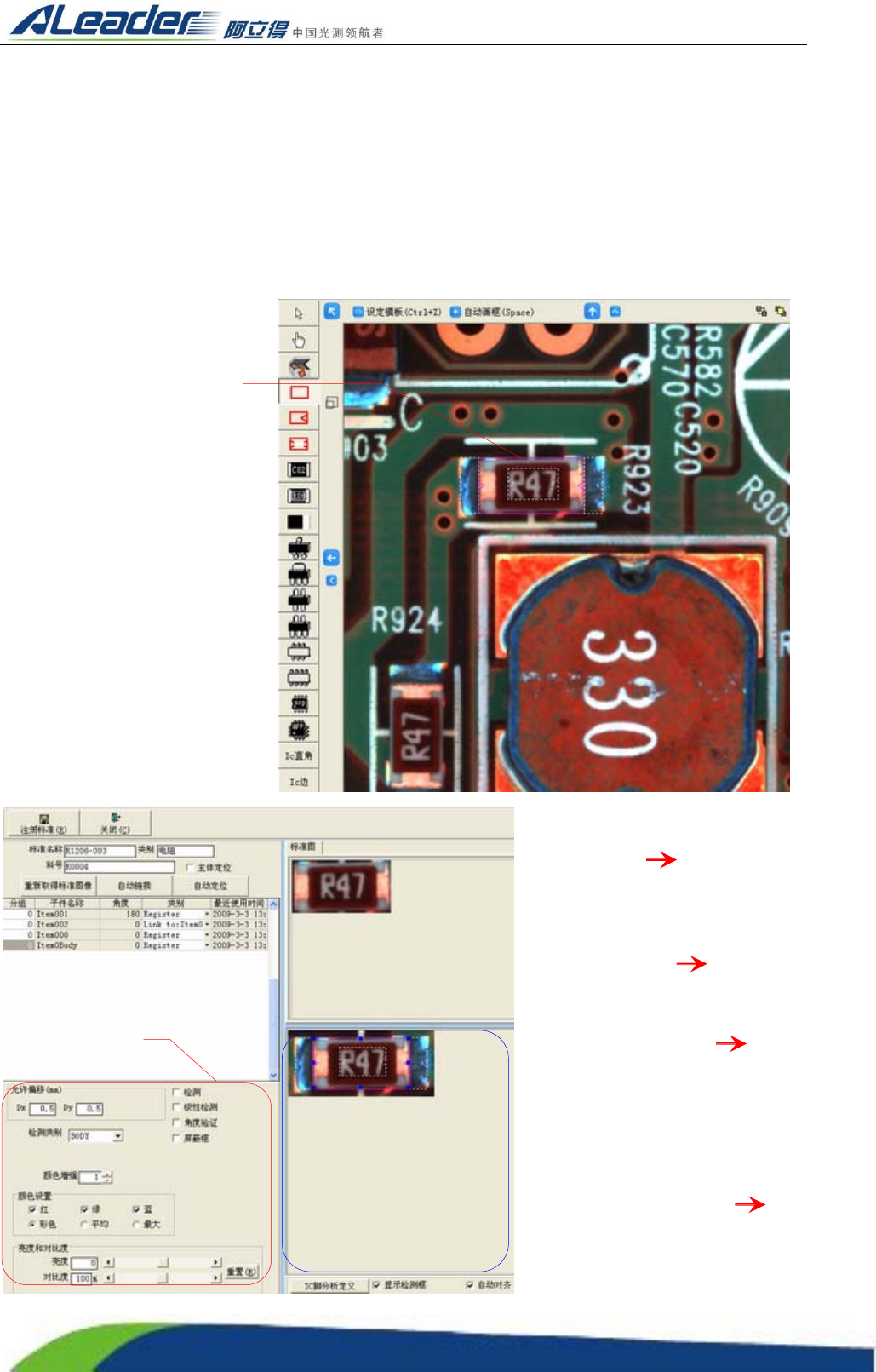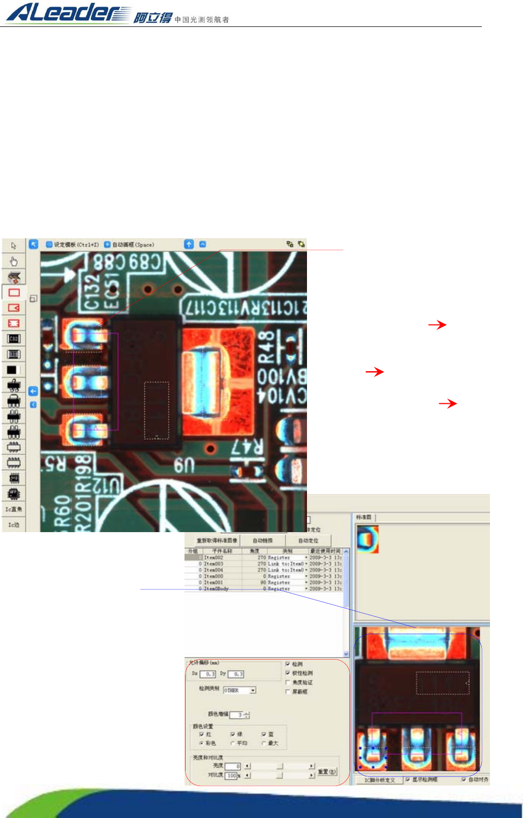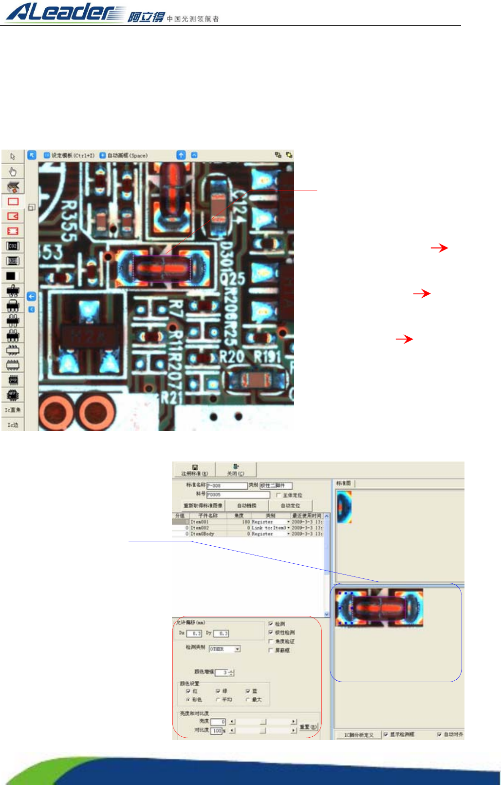 检测过程中不仅仅测元件的正确与否,还对该类元件的极性进行检测和判断。通常在调节像锡点框较