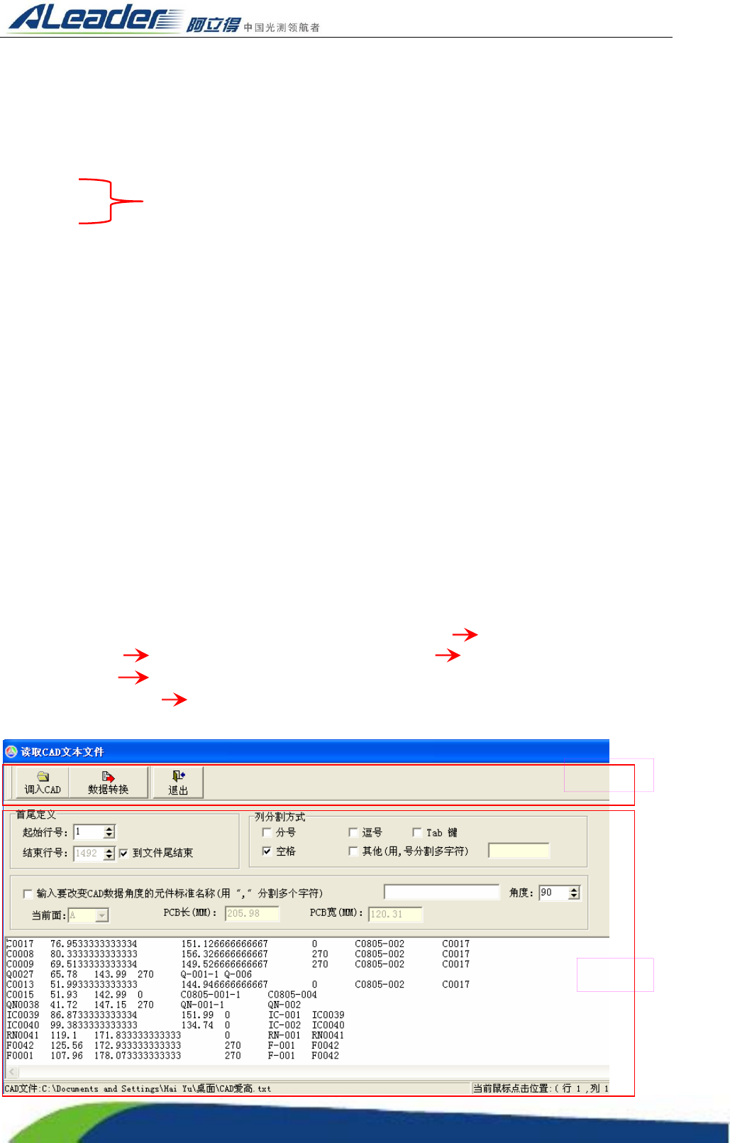 Http:www.aoichina.c om TEL:0769-22620377 2262 0877 FAX:0769-23102060 Page:53 of 11 5 3.12CAD 数据导入 先从贴片机或坐标机的数据包含以上 4 种数据 元素的数据,并将其转换 txt 文本文件,一般可直接从 贴片机上完成。然后去掉多余的参数,只保留贴片零件的元件脚位、X/Y 坐标、贴片角度和物料号。 AOI 编程时要用到以下数据元素: z 元件脚位…