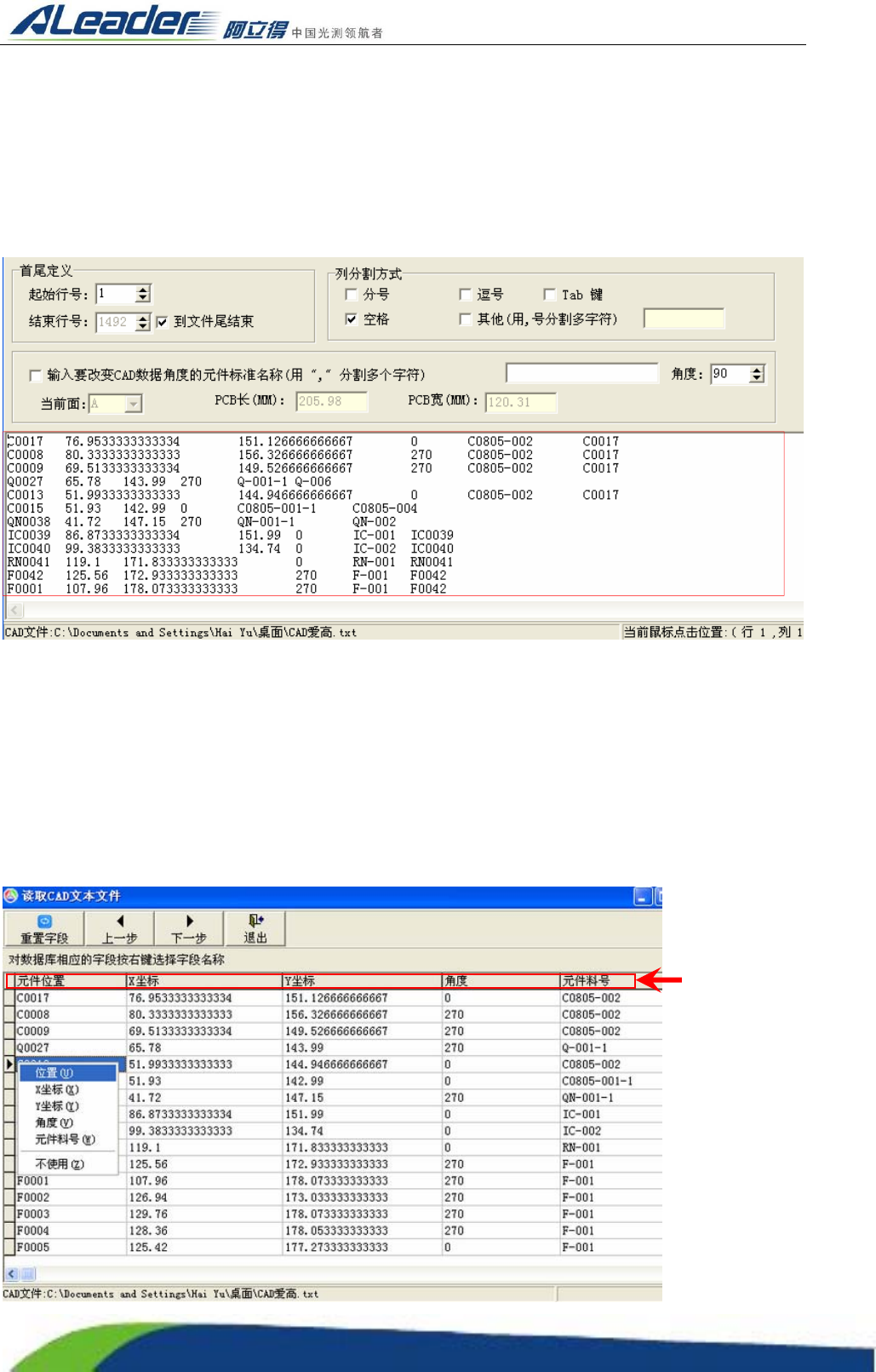 Http:www.aoichina.c om TEL:0769-22620377 2262 0877 FAX:0769-23102060 Page:55 of 11 5 CAD 数据导入后,单击“重置字段” ,对各个字段重新设置名称 1) 元件位置:标准元件在实际坐标系的元件位置名称。 2) X:标准元件在机械坐标系中的横坐标。 3) Y:标准元件在机械坐标系中的纵坐标。 4) 角度:标准元件在机械坐标系中的角度。 5) 标准名称:标准…