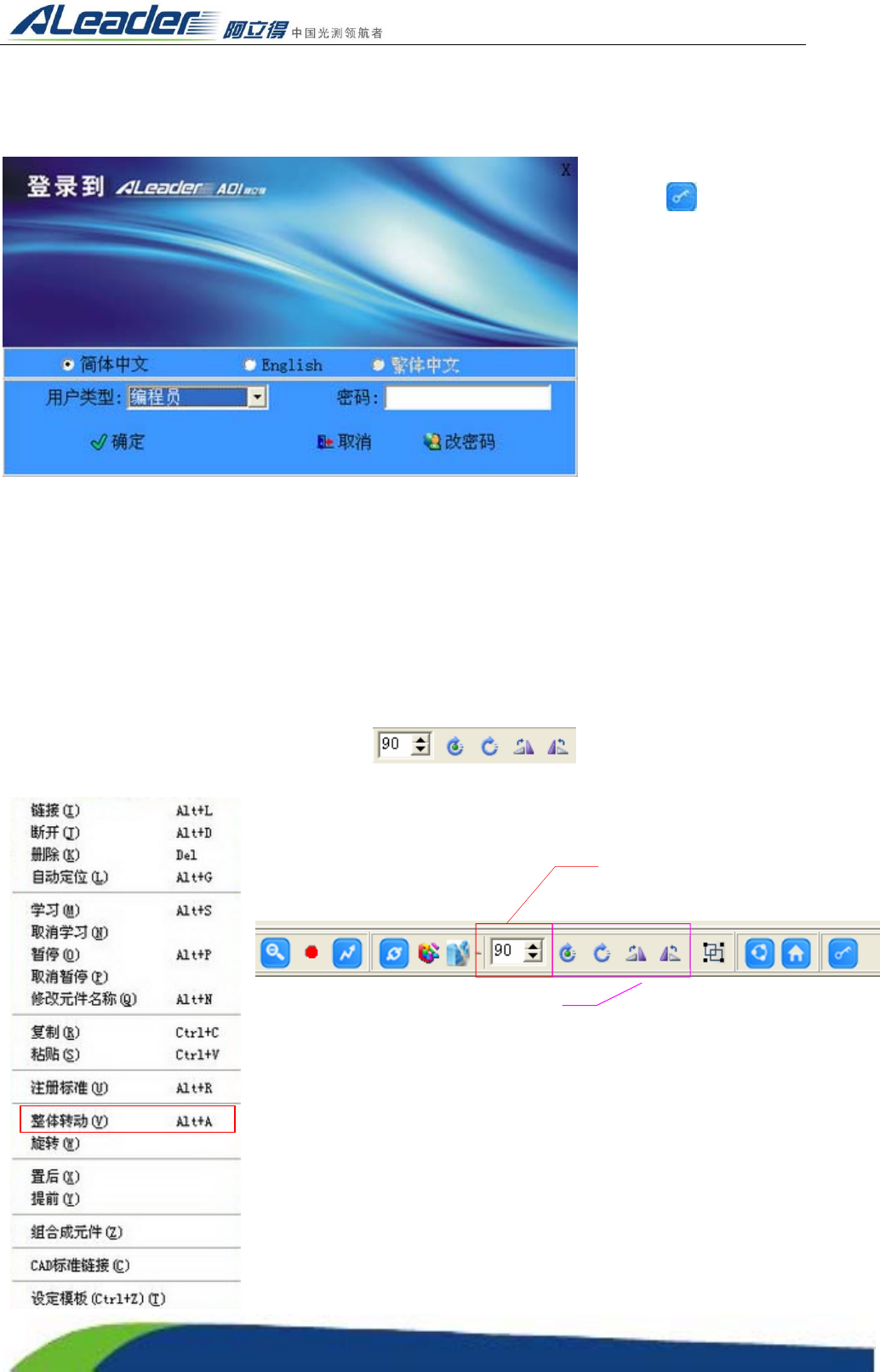 Http:www.aoichina.c om TEL:0769-22620377 2262 0877 FAX:0769-23102060 Page:90 of 11 5 4.16 改变操作状态 如需要在编辑状态和操作状态之间切换(默认为操作状态) ,需要进行模式改变的操作 步骤:选择工具栏的“重 新登陆” 图标,打开 “登录界面”选择“用户 类型”即可。 4.17 修改元件角度 角度的旋转分为两种:整体旋转 和本地旋转,整体旋转 是指“…