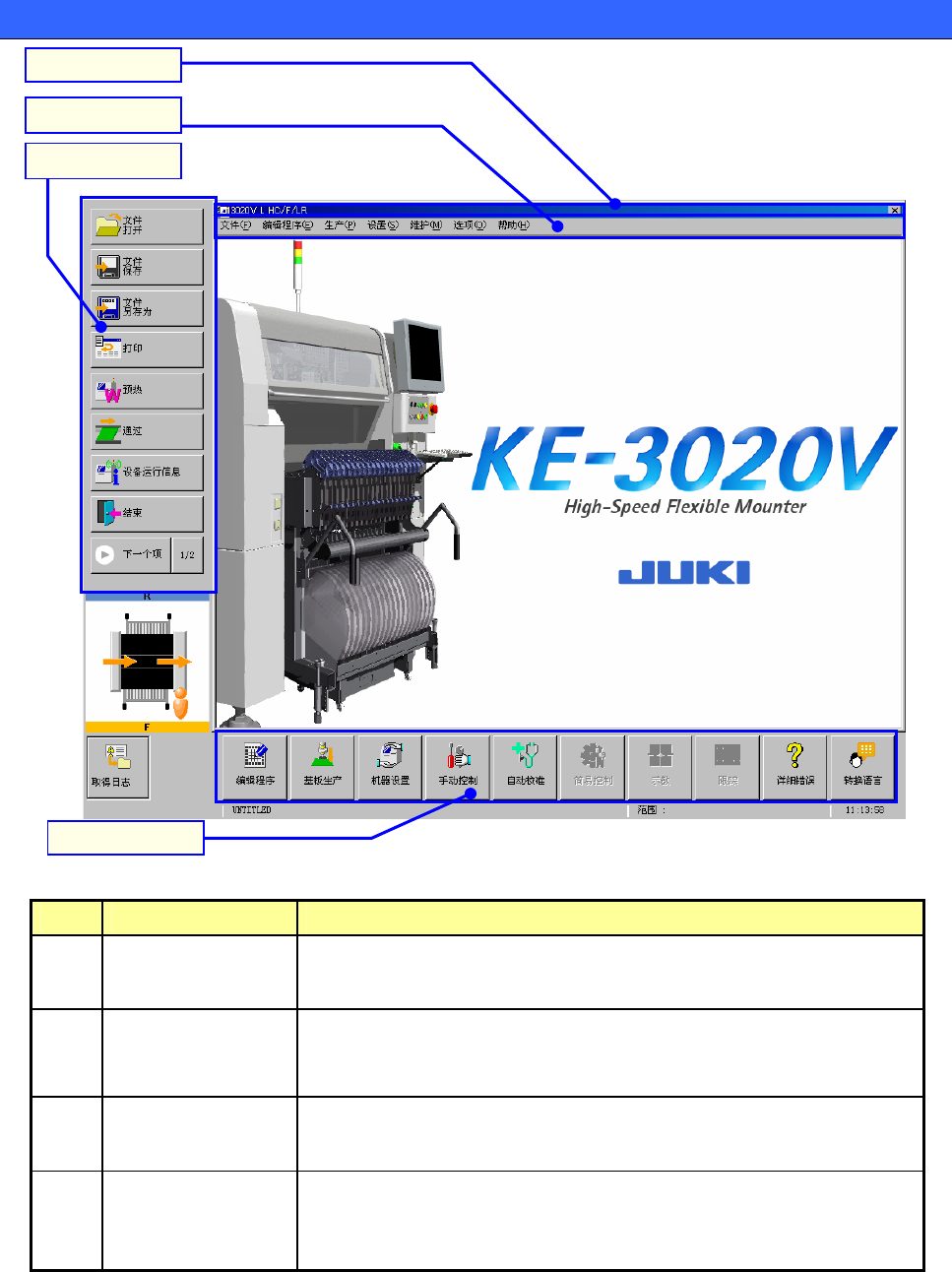 操作手册 I 2-3 2-3 操作画面的说明 No. 名 称 功能概要 ① 标题栏 窗口的标题。 显示的窗口功能不同,标题也不同。 ② 菜单栏 显示该窗口可使用的最高层次菜单。 (窗口不同,显示的菜单也不同。 ) 有些菜单,可以显示下拉菜单。 ③ 命令按钮 有一部分菜单项目,可用快捷方式调出在窗口上使用。 用图标显示系统的各台架的运转及操作方向。 ④ 功能栏 可用快捷方式调出有代表性的系统功能。 可切换显示的语言或应用程序。 还可显示生…