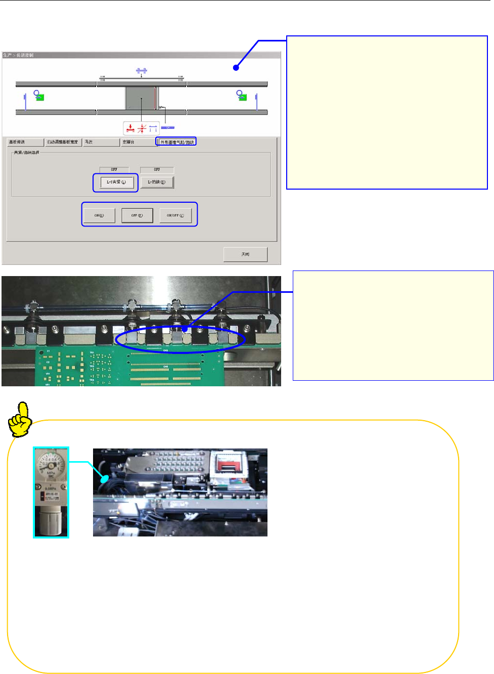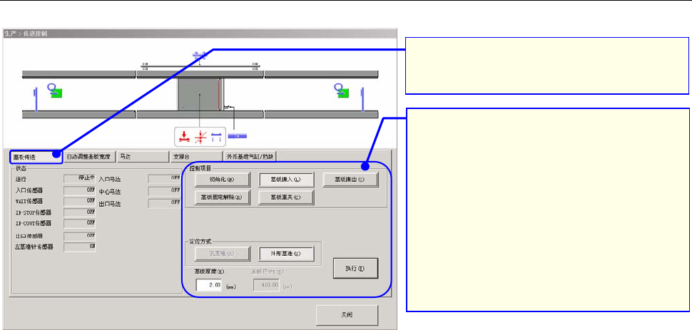 操作手册 I 3-12 Step5-2 在基板搬送画面上 执 行基板搬出。 请确认是否保持与生产时的动作同步传送基板,传送动作是否有问题。 2 . 把基板安装在 IN 缓冲,确认连续动 作时基板流动是否顺畅。 选择[基板搬入]-[执行]后,基板即可搬 入、夹紧。 选择「基板搬出」- 「执行」 后,基板即可 搬出 。 1. 按下「基板传送」按钮,即显示「基 板传送」画面 。