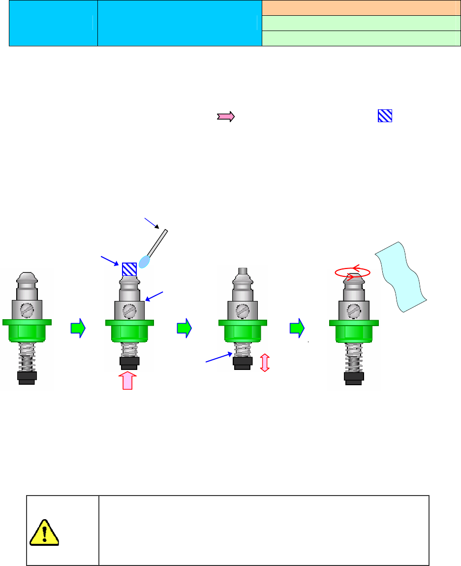 操作手册 I 4-20 1) 500~504、509 号吸嘴,可整个浸入酒精液里,在超声波清洗器中清洗约 5 分钟。 2) 使用超声波清洗器清洗 505~508C 号吸嘴时, 为防止用酒精清洗造成吸嘴尖头氨基甲酸乙酯部分剥离, 因此,请用夹具等把吸嘴倒置放入,防止尖头浸入酒精。 3) 如若氨基甲酸乙酯部分的脏污和吸嘴扩散器的脏污擦不掉,请用软布浸湿酒精擦干净。 4) 为防止吸嘴内部生锈,洗净后,请按下页“清扫吸嘴后上油”的说明注油。 ※…