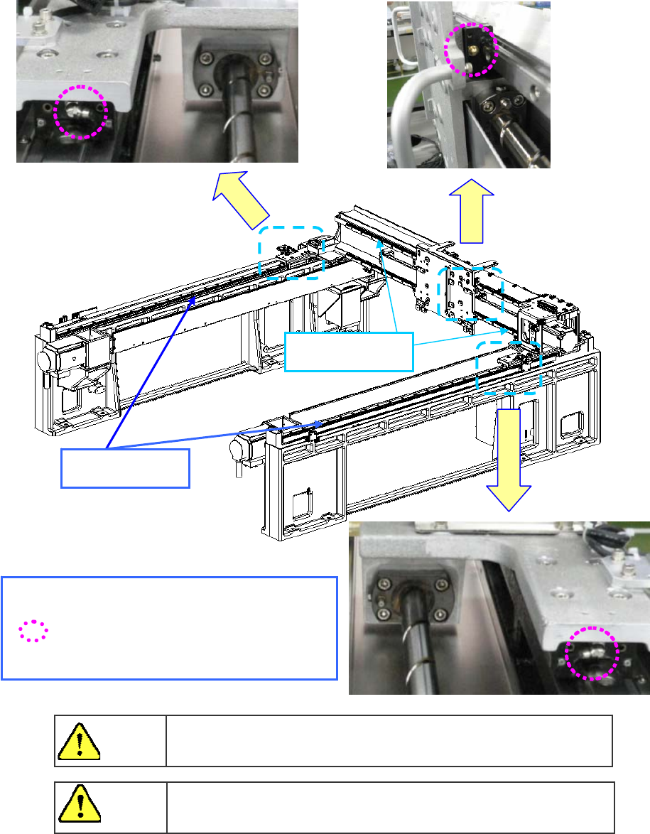 操作手册 I 4-30 4-4 注油 1) 用黄油枪,从 XY 轴直动单元的黄油注油孔注入黄油。 <M、L、L-Wide 基板规格 > 注油项目 4-4-1 XY轴直动单元 实施频度 : 每6个 月 使用工具 :黄油枪 注油处 XY 轴直动单元(黄油注油孔) 使用润滑油 :6459 润滑油 N LM 导轨和滚珠丝杠的黄油是不同的。请不要混合使用。 注 意 为防止突然起动造成事故,请切断电源后进行维护作业。 危 险 ※注油孔 …