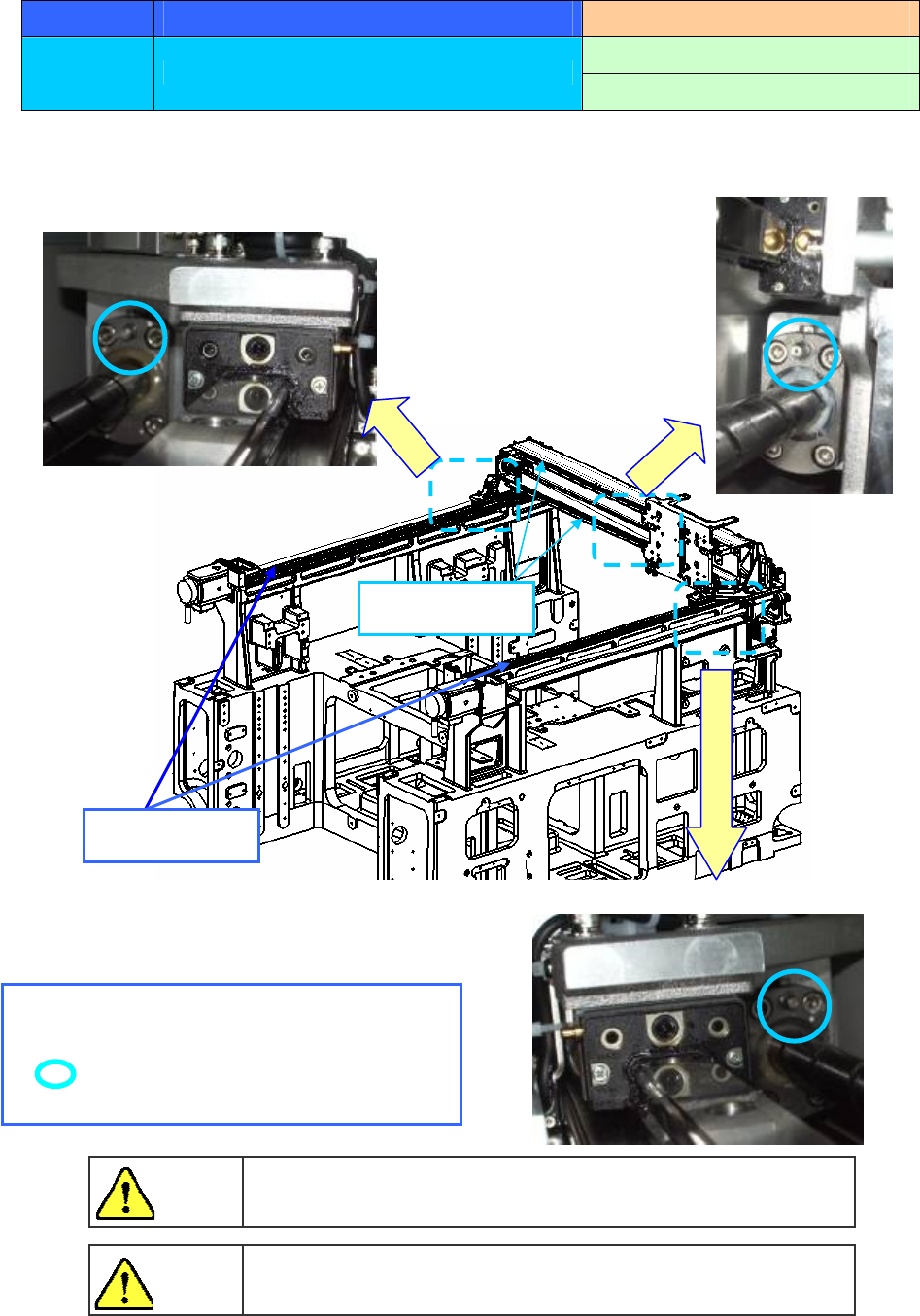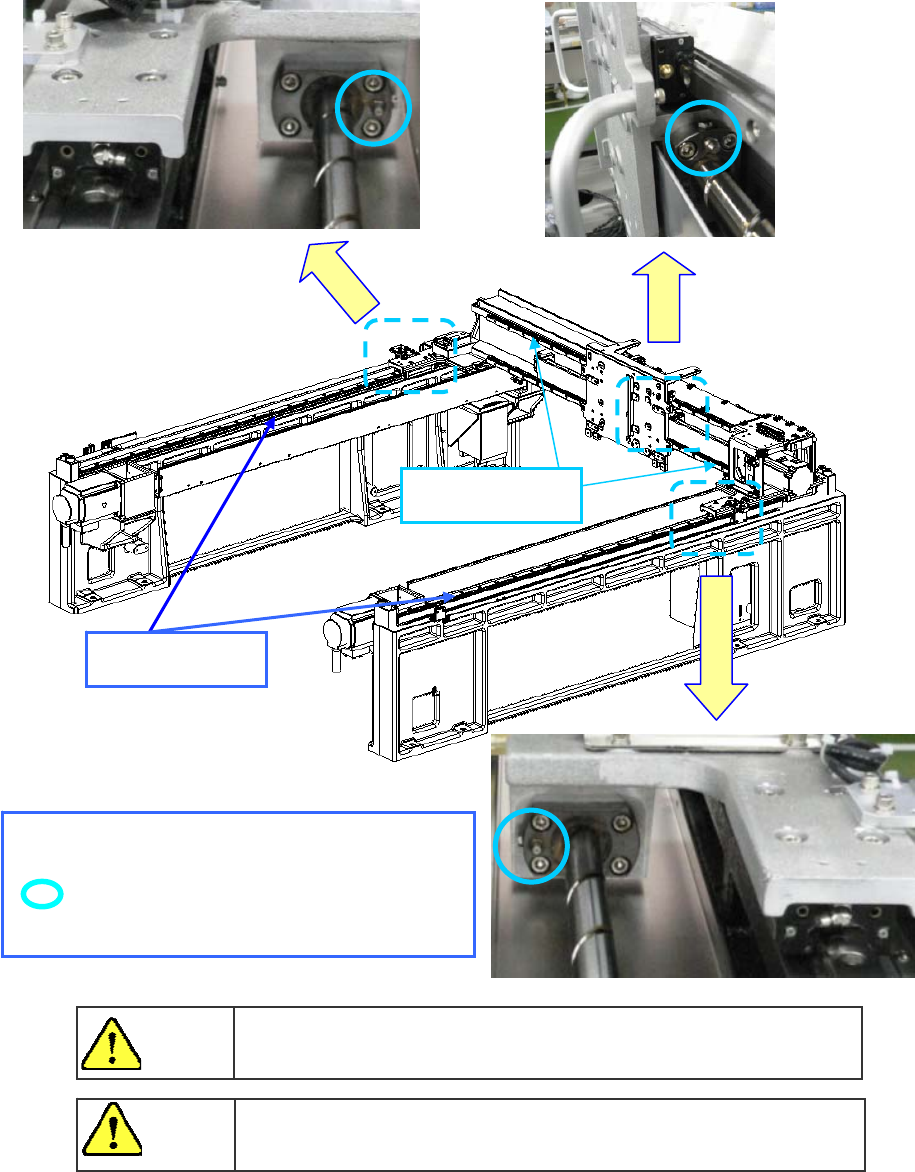 操作手册 I 4-33 <XL 基板规格 > LM 导轨和滚珠丝杠的黄油是不同的。请不要混合使用。 注 意 为防止突然起动造成事故,请切断电源后进行维护作业。 危 险 ※注油位置 圆圈部位滚珠丝杠 注油孔 Y轴滚珠丝杠 X轴滚珠丝杠