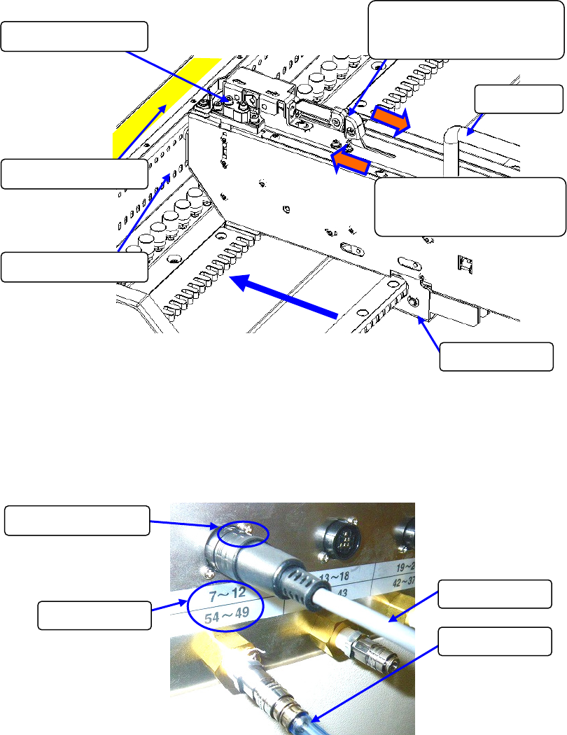 操作手册 3) 向身边拉紧固把、保持不动,将装置向前方滑动,直至装置前端的基准销插入固定板。向身 边拉紧固把②、保持不动,将装置向前方滑动,直至装置前端的基准销①插入固定板。 4) 在顶住的位置上从紧固把松手,将装置固定。 在顶住固定板的状态下从紧固把松手,紧固把会回到原来的位置,下部的锁架③会关闭,将 装置固定。 ※固定体夹臂的固定螺丝延长线上的数字,即为装置安装的通道号。 5 ) 把从装置后端伸出的线缆插到主机上。 请将电源线插头方…
