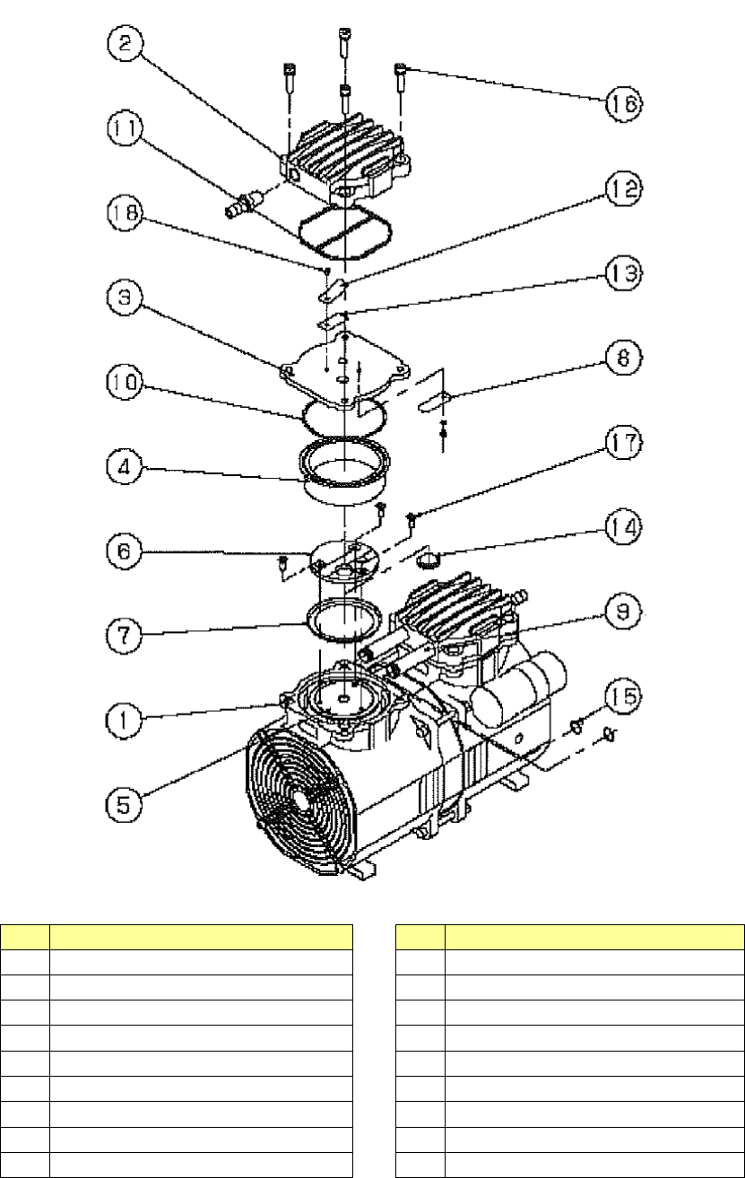 操作手册 真空泵分解图 No. 名称 No. 名称 1 支柱 10 O 环 S- 67 2 泵头盖 11 密封材 3 泵头支架 12 排气阀按压件 4 碗形密封气缸 13 排气阀 5 连杆 14 防止吸气阀碰触胶垫 6 固定器 15 O 环 P- 10 7 碗形密封垫 16 内六角螺栓( M5×20 ) 8 吸气阀 17 平头小螺钉 (M4×8) 9 连接管 18 圆头小螺钉 (M3×5) 3- 18