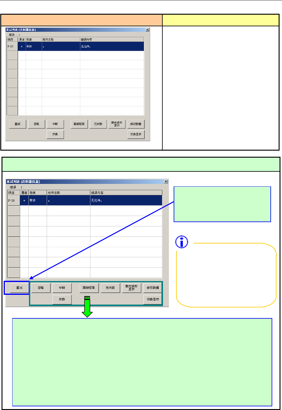 操作手册 4 生产时的各项处理 本章主要讲解生产中发生的错误·用完元件时的处理方法。 4-1 用完元件(在操作选项中选中“ 无元件暂停”时) 出现用完元件时立即显示如下画面,装置暂停。 错误画面 错误要因、原因 ①用完元件。 ②元件吸取错误。 (因带子剥离缠住、传 送不良等 造成吸取位置偏离等) 处理错误的方法 在元件用完停机时,按画面的「示教」按键,可以进行吸附跟踪。(即可以再次确认 元件用完部位的吸附位置)确认后,如果发现偏移大时,…