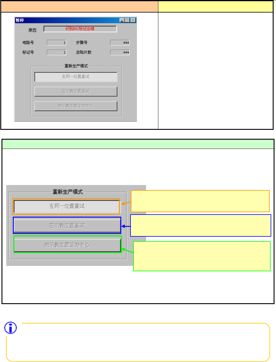 1) 遇到「激光脏污错误」时,贴片头将移动到前面后暂停。