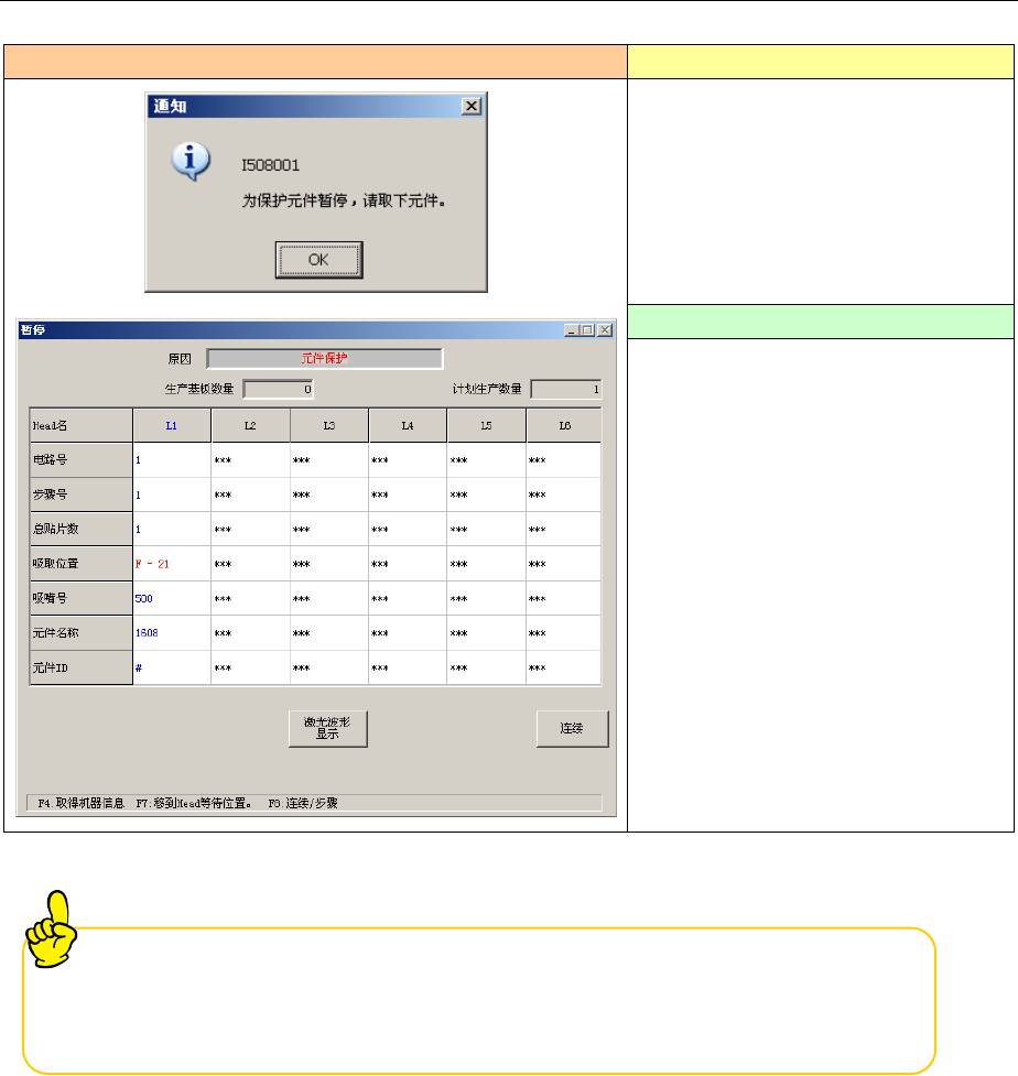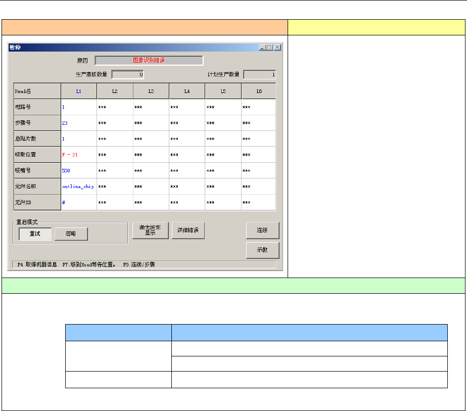操作手册 4-6 发生图像识别异常错误 错误画面 错误因素,原因 ①元件的引脚弯曲。 ②元件的引脚、球面氧化。 ③托盘元件的供给角度错误。 ④制作图像数据错误。 处理错误的方法 改善错误原因后,按下开始开关,重启生产。 发生错误的时间 确认和处理 补充元件后立即 检查供应元件有无错误 检查托盘供应的元件供给方向(角度)有无错误 正常生产中 检查 VCS 单元有无尘埃、异物 4-6