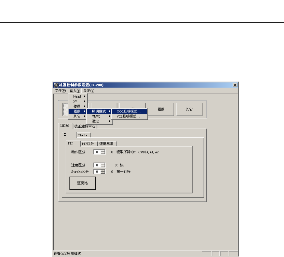 Rev. 1.0 机器控制参数 2-2-4 图像 选择了 [ 画像 ] 之后,就会显示出如图 2-2-4-1~ 图 2-2-4-2 所示的级联菜单。 图 2-2-4-1 图像菜单 ( 照明模式 ) (1) 照明模式 进行照明控制参数的设定。 ( a ) 进行 OCC 的照明模式的设定。 ( b ) 进行 VCS 的照明模式的设定。 2-6