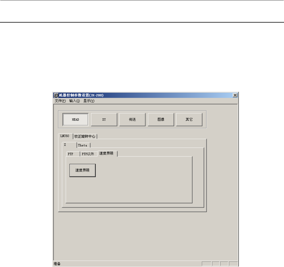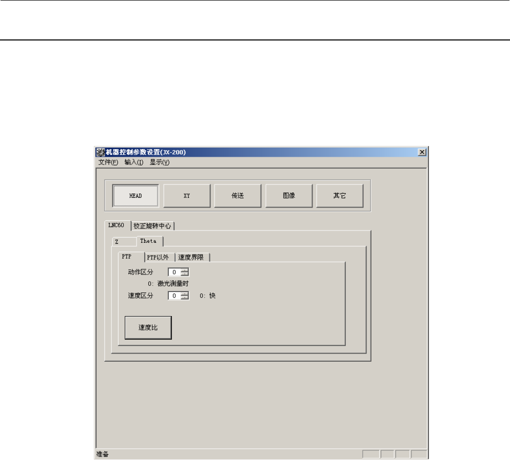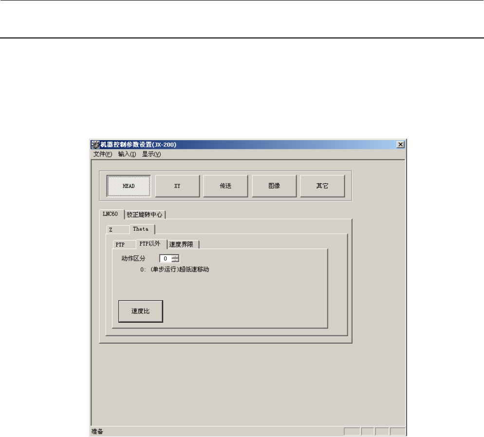Rev. 1.0 机器控制参数 3-1-4 θ 轴 PTP 以外的动作的起动画面 选择了 [LNC60][T][PTP 以外 ] 之后,就会显示出如图 3-1-4 所示的表格。 图 3-1-4 θ 轴 PTP 以外的动作的起动画面 把 “ 动作区分 ” 设定到想编辑的目录中,选择了 [ 速度比 ] 按钮之后,设定的分类选择画面就被显示出来。 目录在各画面也可以变更。 区分的详细内容请参阅 4-1-4 。 3-4