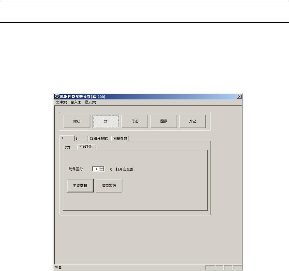 Rev. 1.0 机器控制参数 3-2 XY 选择了起动画面的 [XY] 按钮之后,就会显示出如图 3-2-1~ 图 3-2-5 所示的表格。 3-2-1 PTP 动作的起动画面 选择了 [X][PTP] 或 [Y][PTP] 之后,就会显示出如图 3-2-1 所示的表格。 画面为 [X] 时的情形, [Y] 也一样。 图 3-2-1 PTP 动作的起动画面 把 “ 速度区分 ” 、 “ 行程区分 ” 设定到想编辑的目录中,选择了 [ …