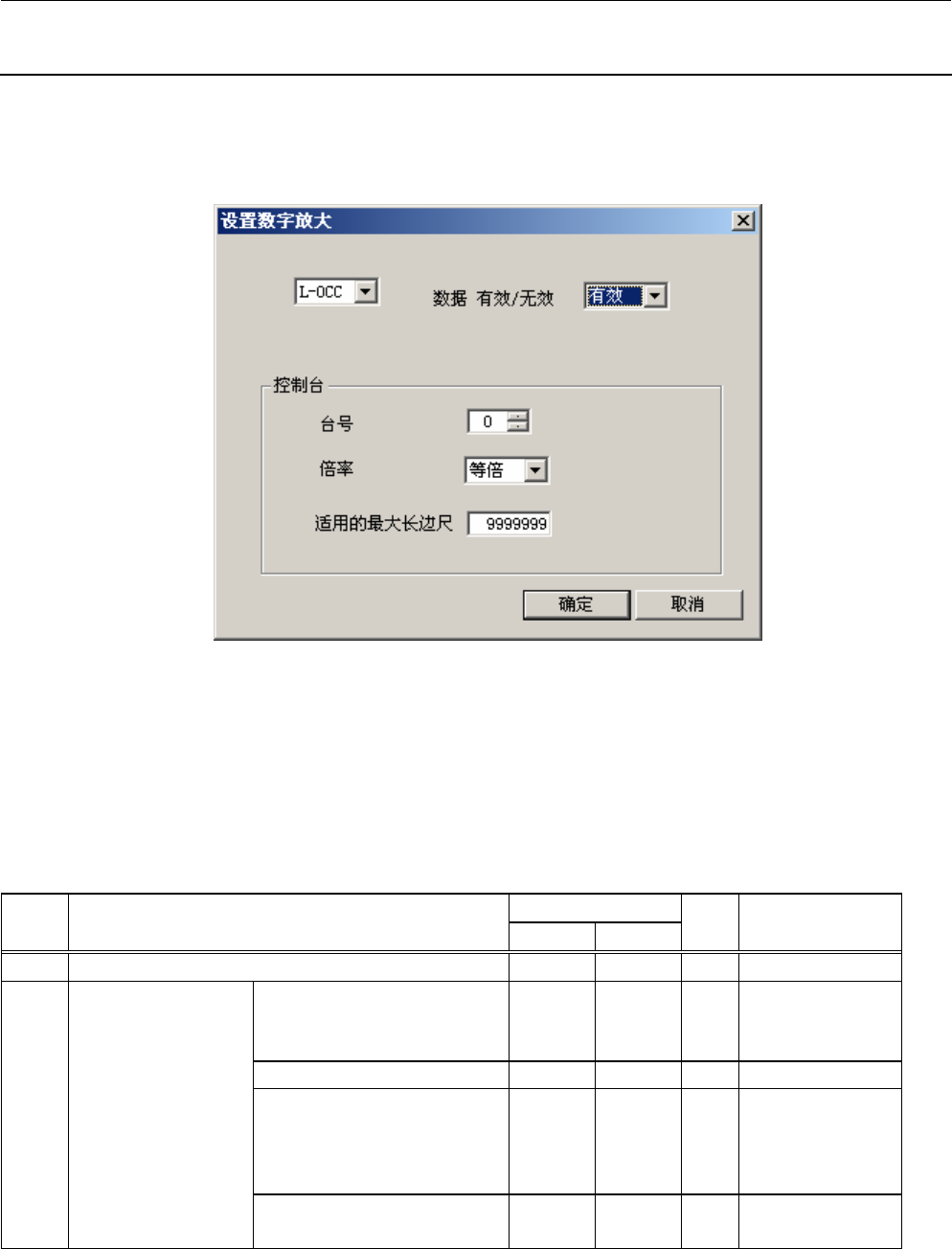Rev. 1.0 机器控制参数 4-4-7 设置数字放大 图 4-4-7 设置数字放大 (1) 设定画面的显示方法 菜单∶ [ 输入 ]→[ 画像 ]→[ 设定 ]→[ 设置数字放大 ] 起动∶ [ 画像 ] 按钮 →[ 设定 ] 标签 →[ 设置数字放大 ] 按钮 (2) 设定项目 输入范围 № 项目 最小值 最大值 单 位 备考 1 L-OCC 摄像机 数据有效 / 无效 0 :无效 1 :有效 台号 0 3 倍率 0 :未设置 1…