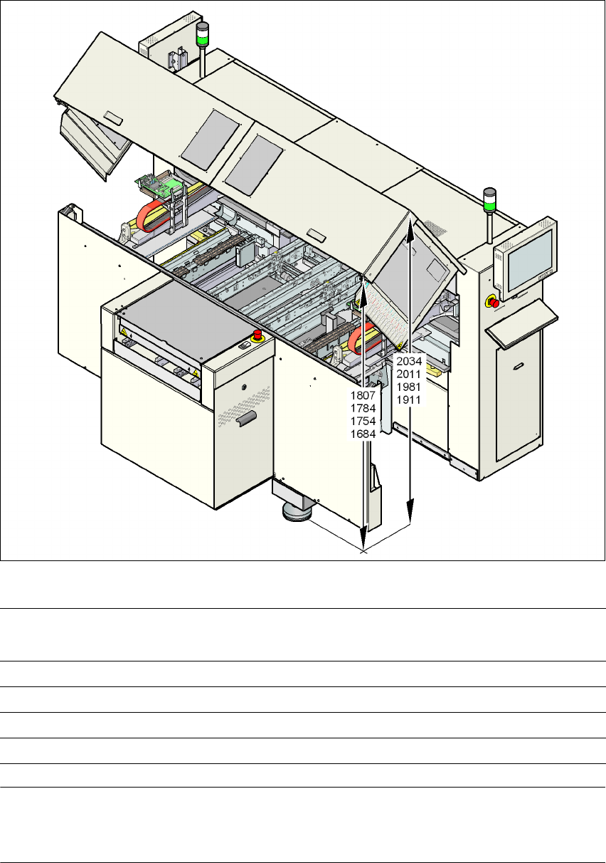 Betriebsanleitung SIPLACE D1i/D2i 3 Technische Daten des Automaten Ab Softwareversion SR.605.03 SP2 Ausgabe 10/2012 3.4 Abmessungen und Gewicht 105 3.4.2 Abmessungen des Automaten (Grundmaschine) 3 3 Abb. 3.4 - 1 Abmessu…