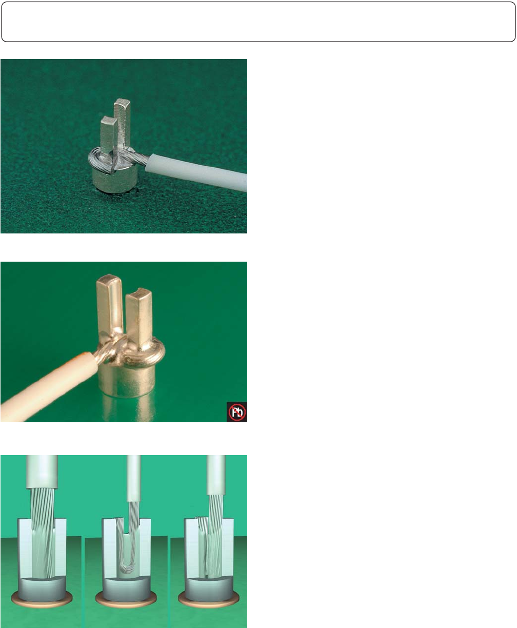 • 对于顶部进线,焊料达到接线柱柱干高度的