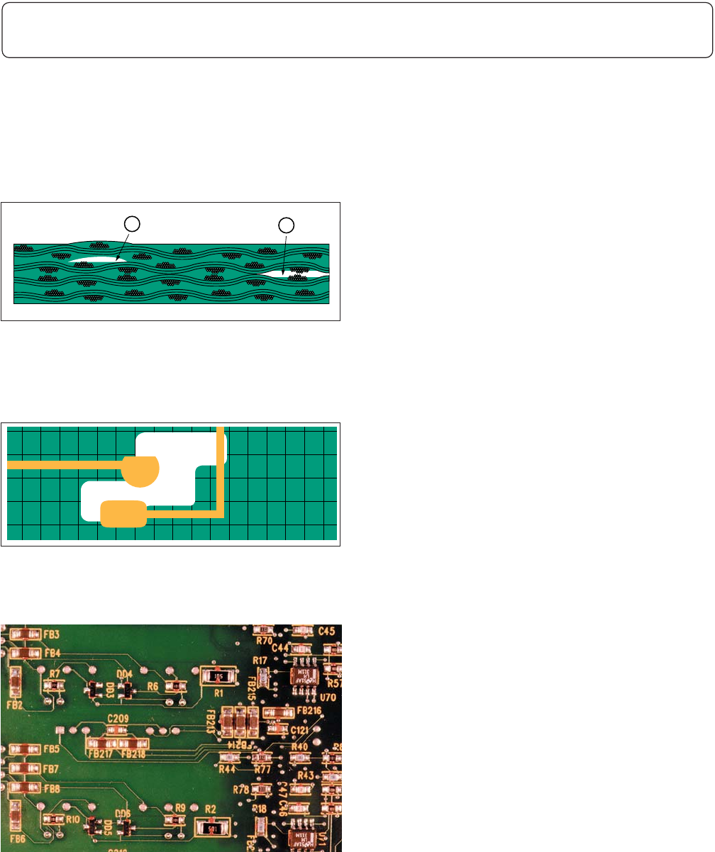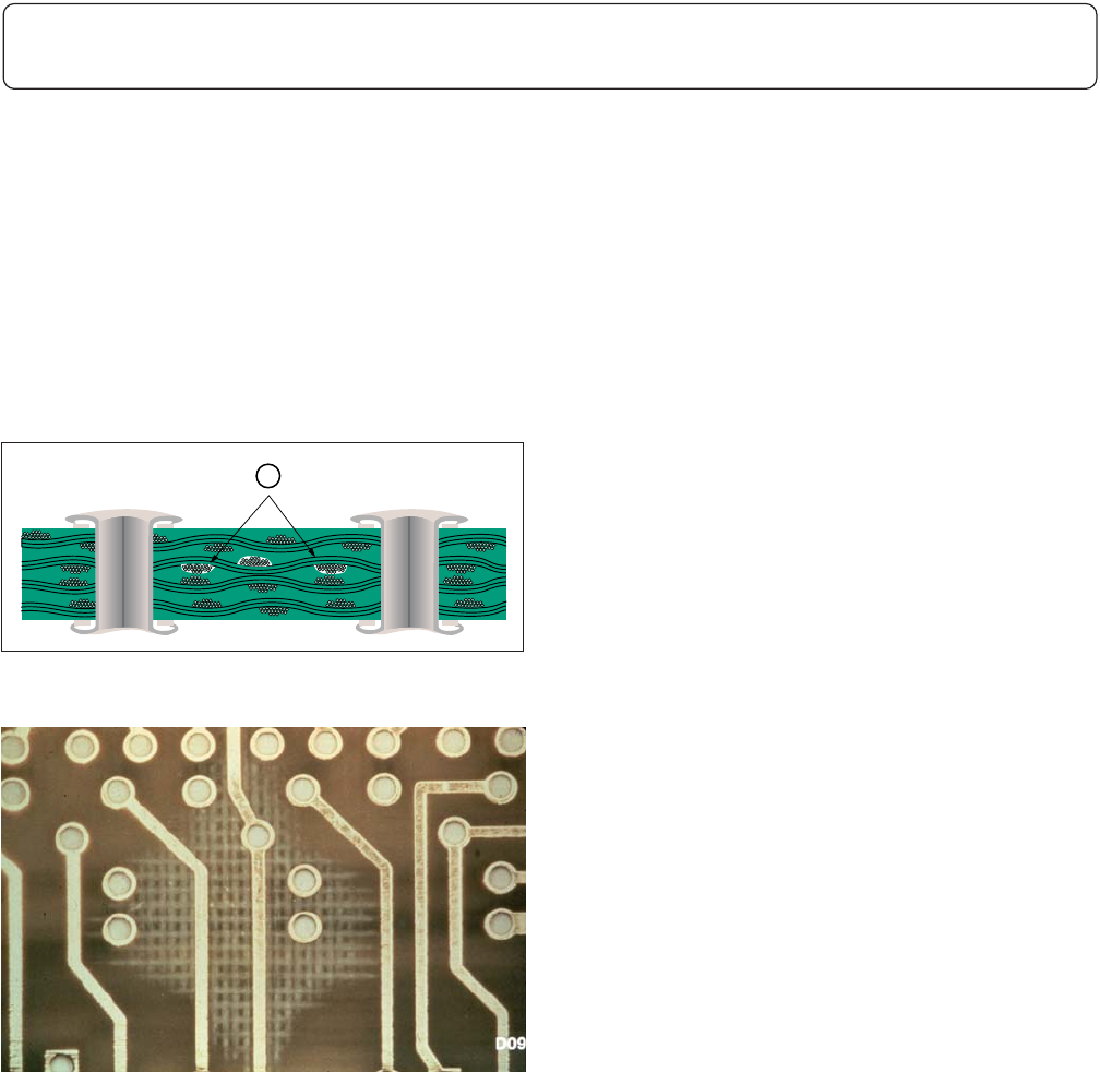 • 层压基板内的白斑区域超过内层导体间物理