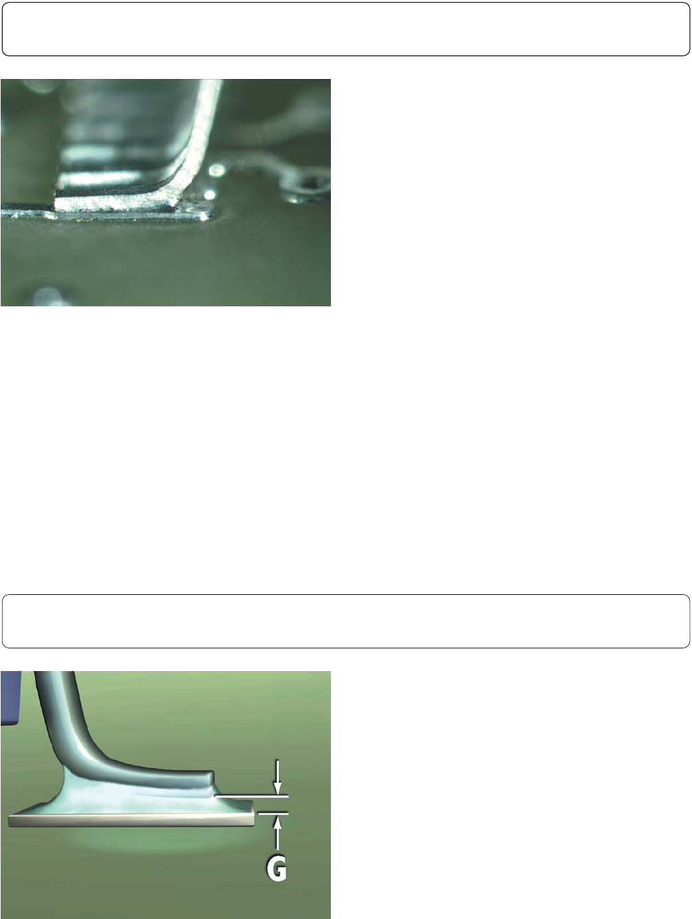 • 最小跟部填充高度(F)小于焊料厚度(G)
