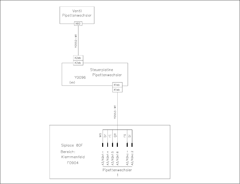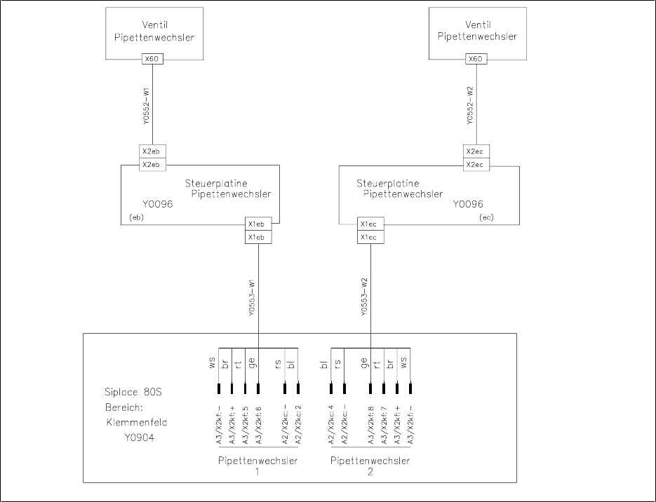 • Schließen Sie das Anschluß Y0553-W1 bzw. Y0553-W2 vom Pipettenwechsler gemäß nachfolgenden
