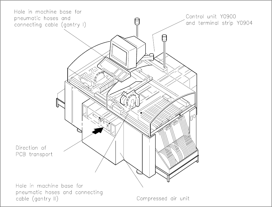 • Push connecting cable Y0553-W2 through the hole in the machine frame to the compressed air unit