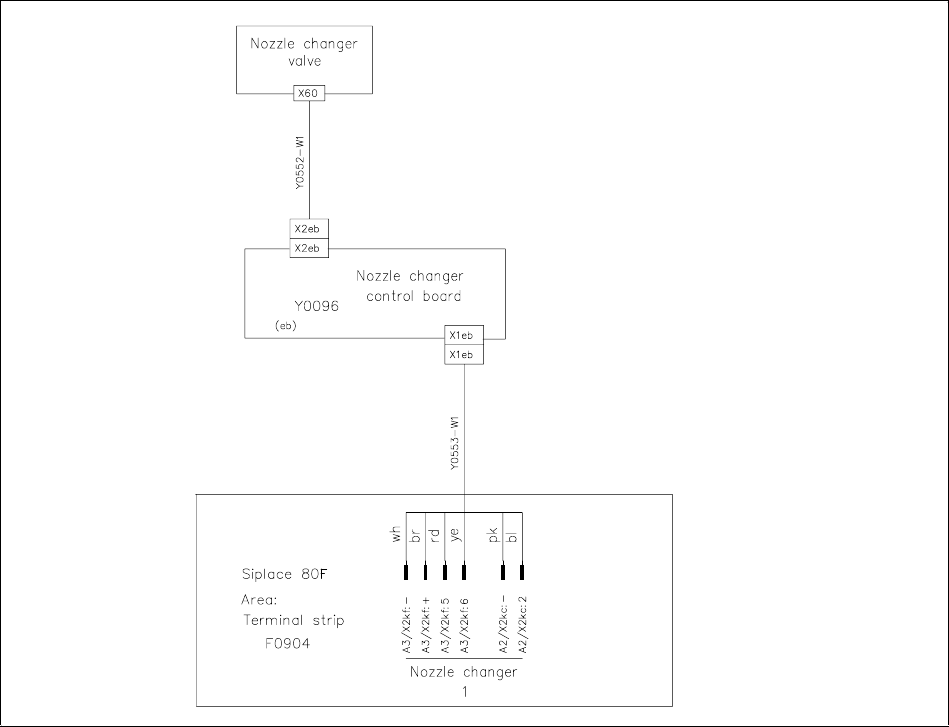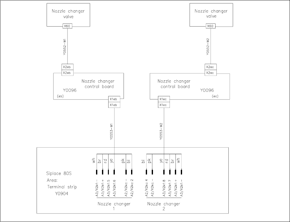 • Connect terminal Y0553-W1 or Y0553-W2 on the nozzle changer to the terminal panel Y0904 as