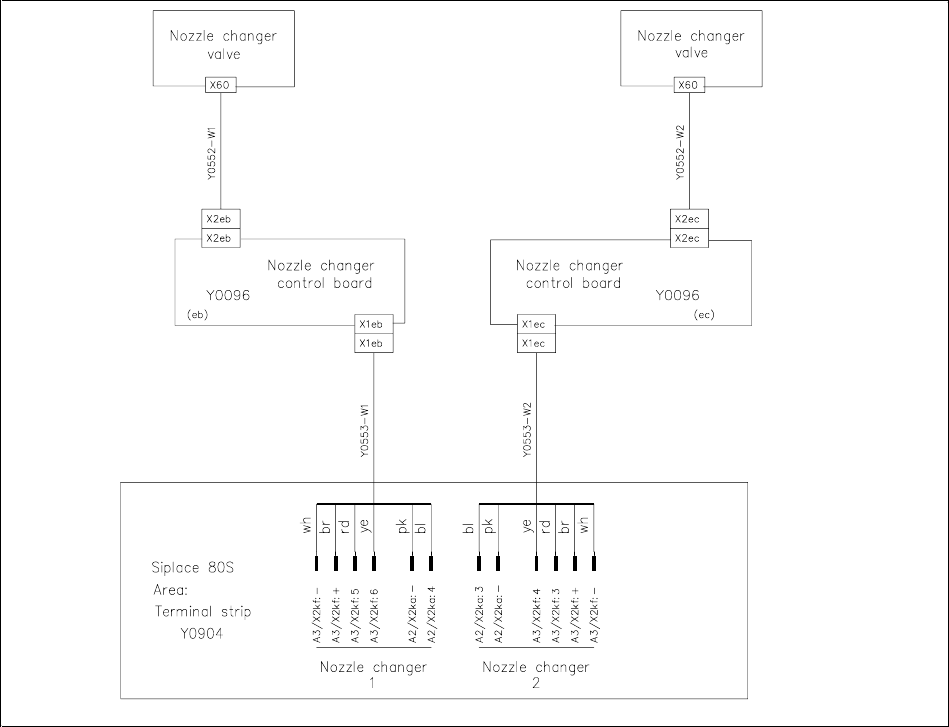 • Connect the terminal Y0553-W1 or Y0553-W2 on the nozzle changer to the terminal strip Y0904, as