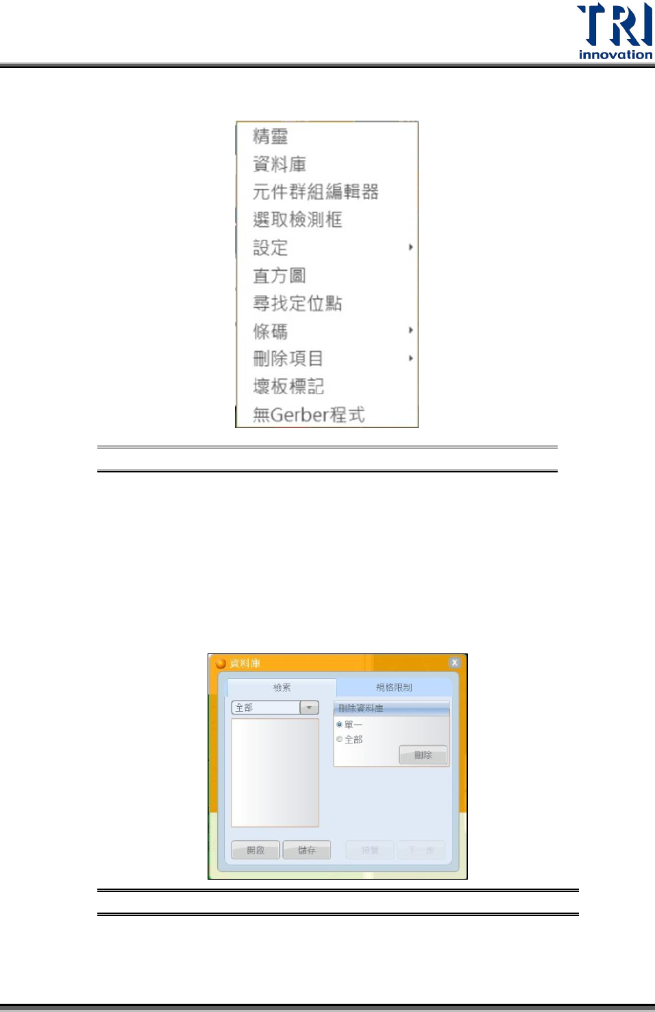 Test Research Inc. 108 TR 7007 User Guide -- So ftware 檢索分頁下 可選擇的項 目示意圖 圖 215 各選項的資 料庫介面示 意圖 圖 216 規格限制:請參閱 4.2 內容。 規格限制介 面示意圖 圖 217