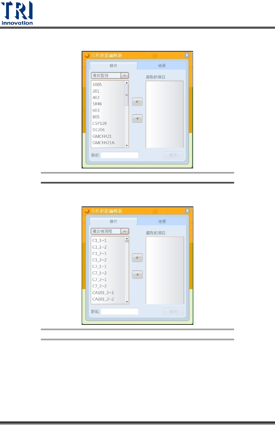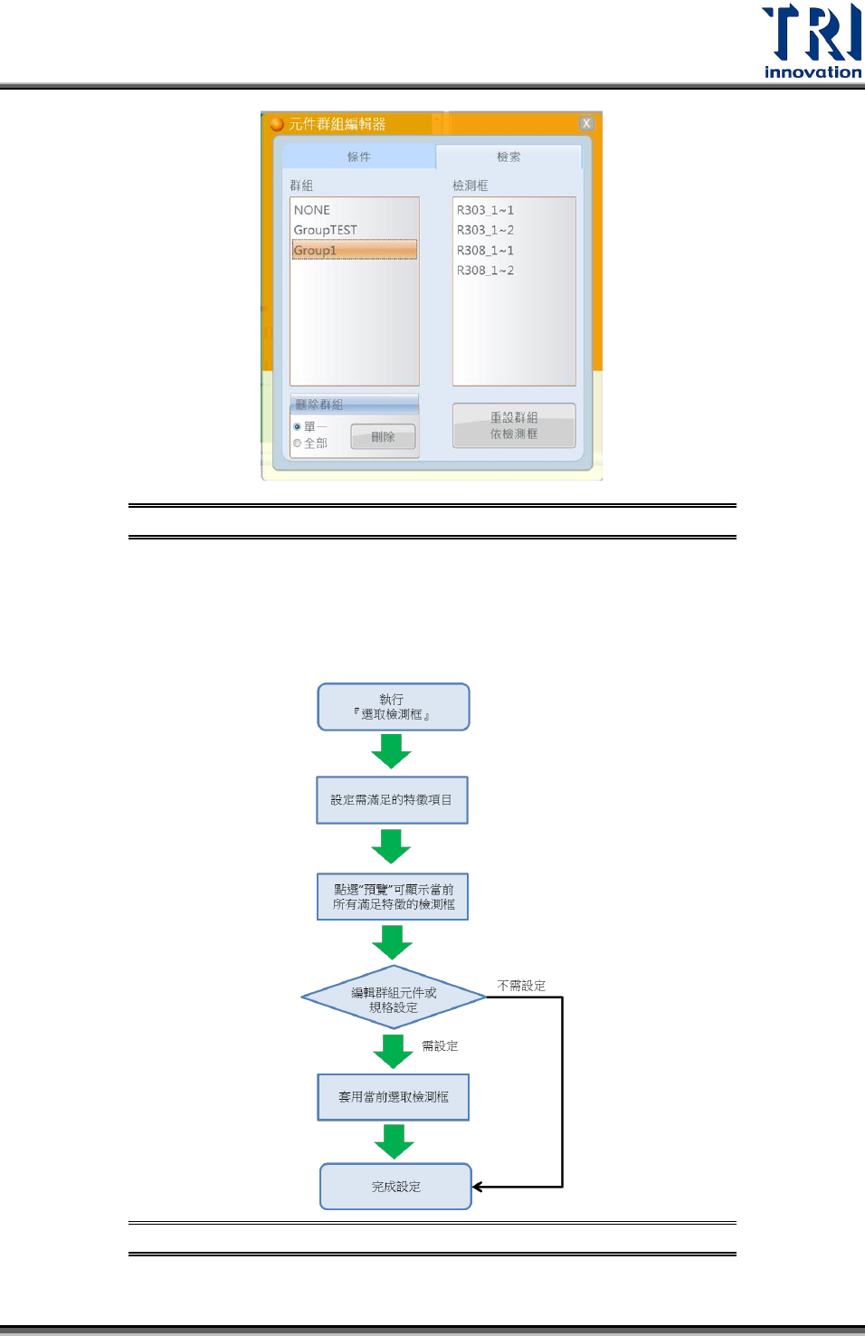 Test Research Inc. TR 7007 User Guide -- So ftware 111 檢索分頁下 介面示意圖 圖 222 5.2.4 選取檢測框 使用者可快速選取符合當前所有特徵項目的檢測框,並可直接進行群組與規格設定。 設定流程如以下: 選取檢測框 流程示意圖 圖 223