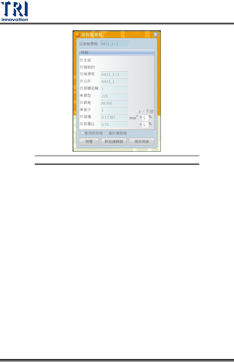 時,預覽符合這兩項特徵項目的檢測框為板子 1 所有符合類型 201 的檢測框,而只勾
