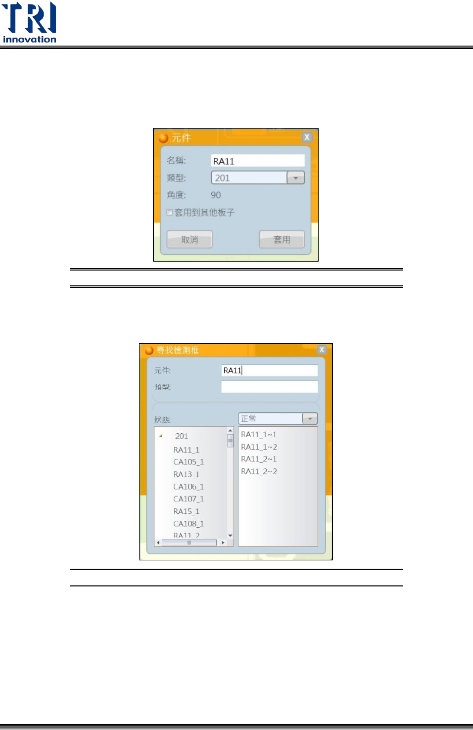 Test Research Inc. 118 TR 7007 User Guide -- So ftware 5.2.5.3 元件 編輯:重新定義當前選取檢測框的名稱與類型,並可選擇是否須套用到其他板子 ( 多 聯板情況下 ) 。 編輯介面示 意圖 圖 236 尋找檢測框:依照檢測框狀態篩選出欲尋找的元件名稱與類型。如下圖所示,手動輸 入元件 RA11 後,於畫面右下方顯示符合 RA11 且為正常狀態的檢測框。 尋找檢測框 介面示意圖 …