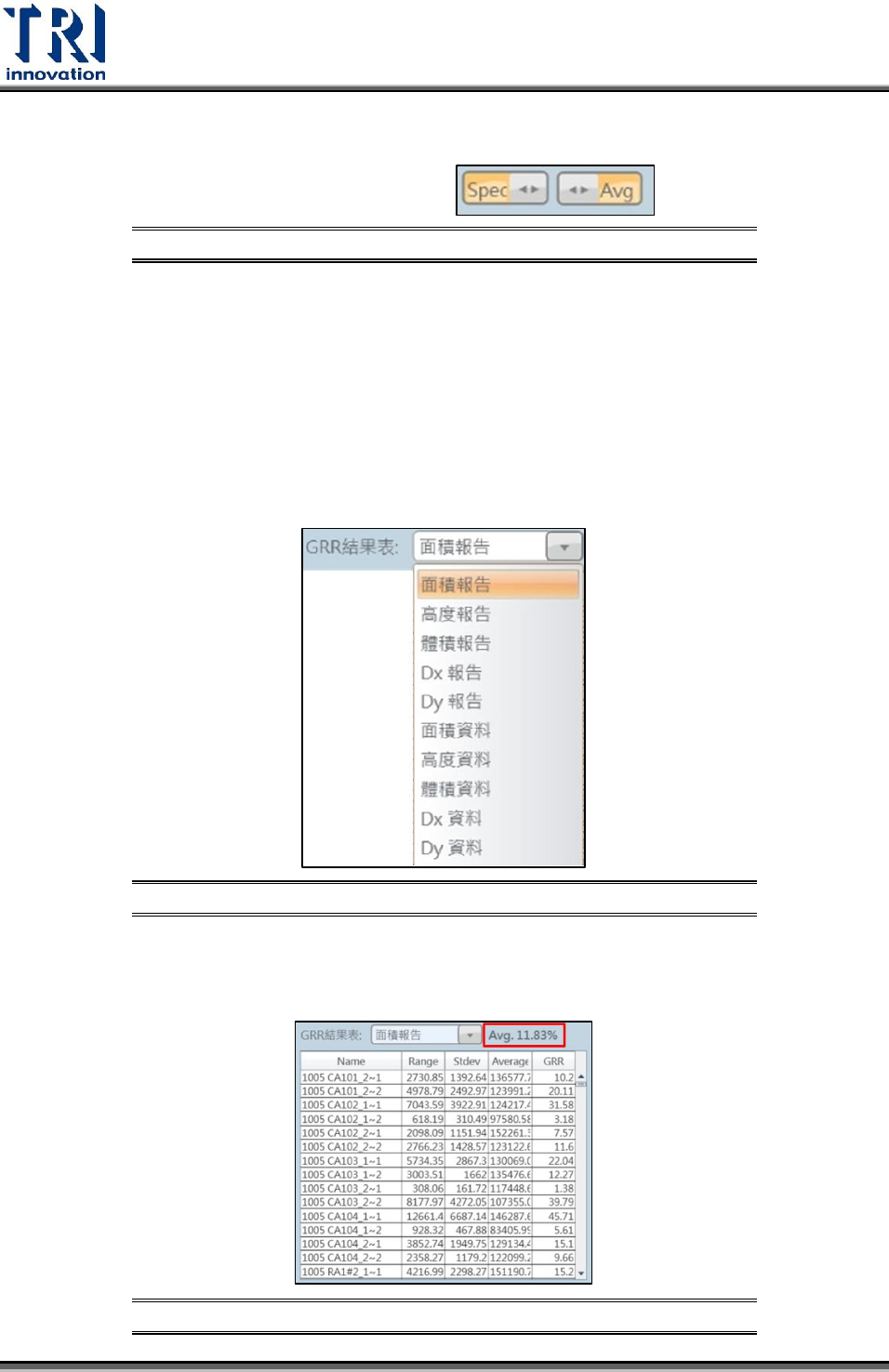 Test Research Inc. 138 TR 7007 User Guide -- So ftware 容許範圍:依據 當前檢測數據的平均值或規格作為上下限設定的基準。 調整容許範 圍的單位 圖 282 Dx / Dy 規格:設定偏移量的規格。 標準差 ( σ ) :假設測試數據為常態分佈,設定標準差的倍數用來計算檢測中無 超出規格的百分比,預設值為 6 。 5. 顯示 GRR 報表:使用者可按照需求選取欲查看的 GRR 分析結果…