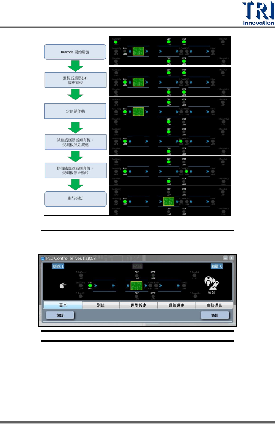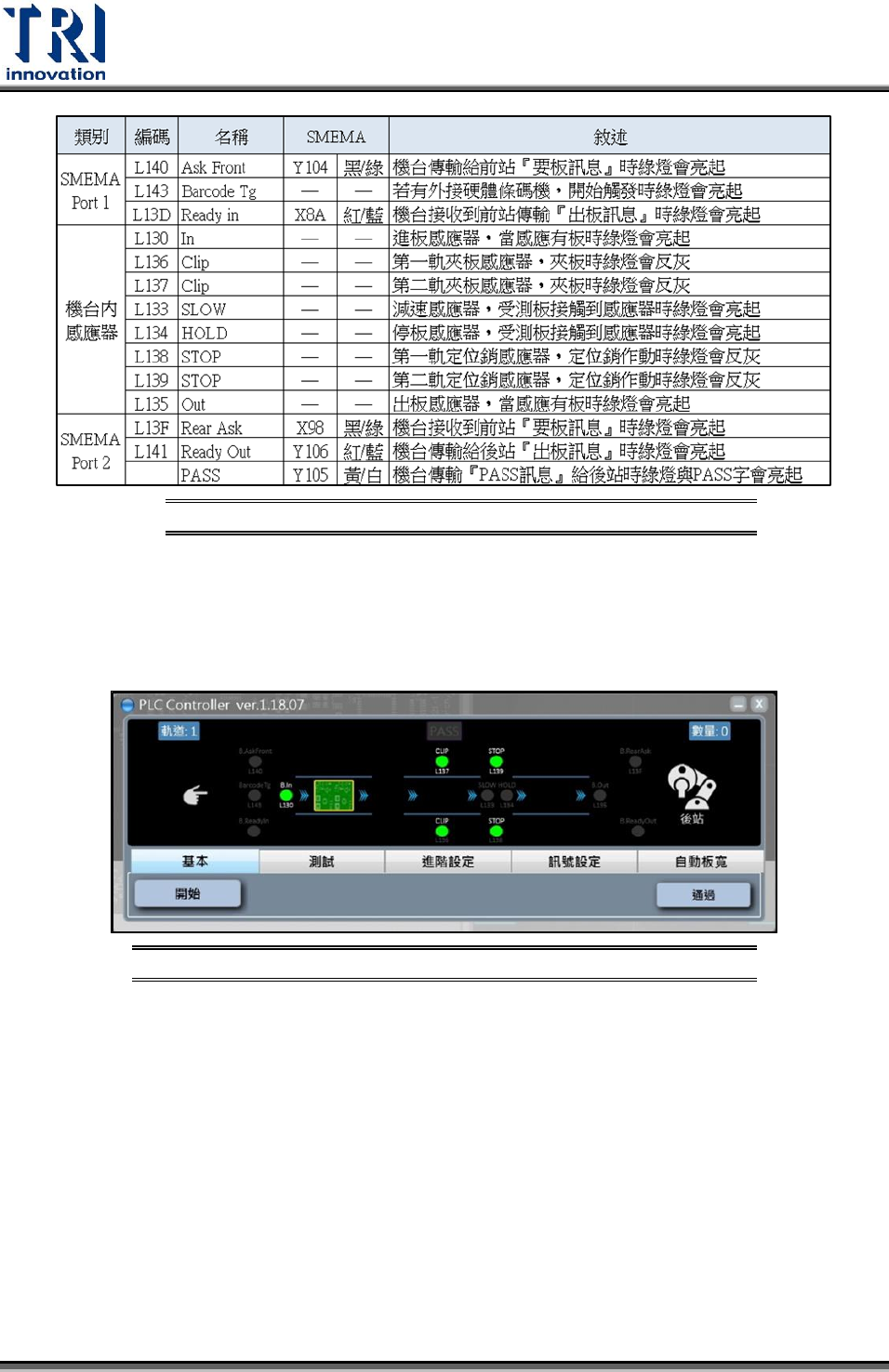 執行開始後機構動作與相對應的感應器燈號狀態說明:假設機台流向為左進/