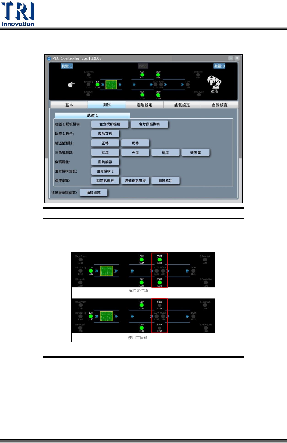 軌道 1 檔板機構: 測試停板定位銷功能按鈕。當功能正常時,使用者按下按鈕時