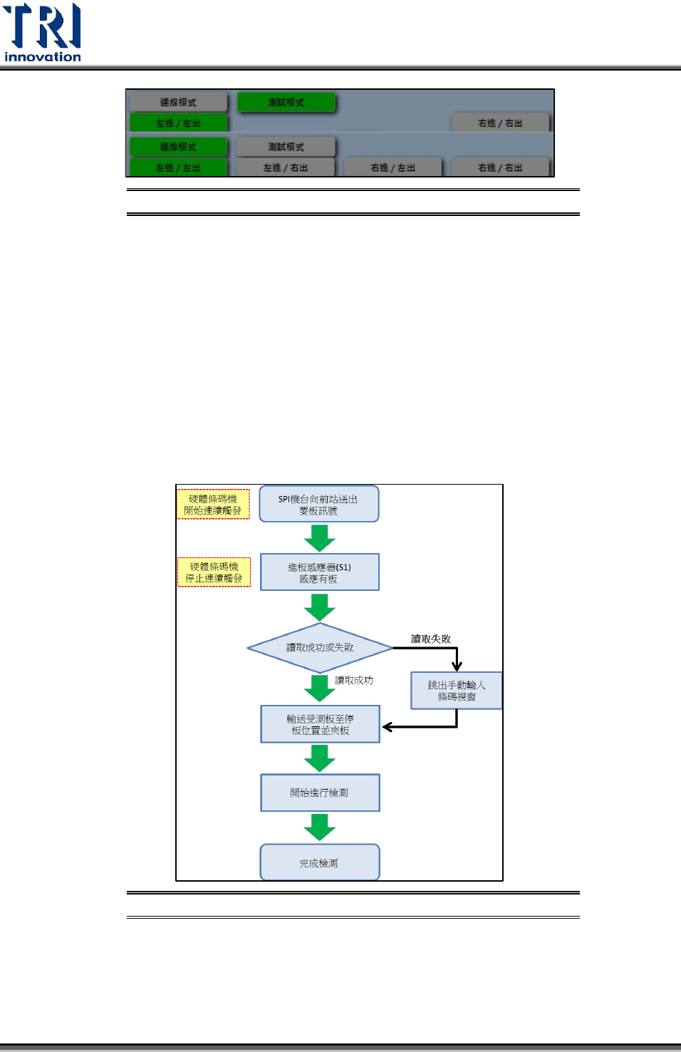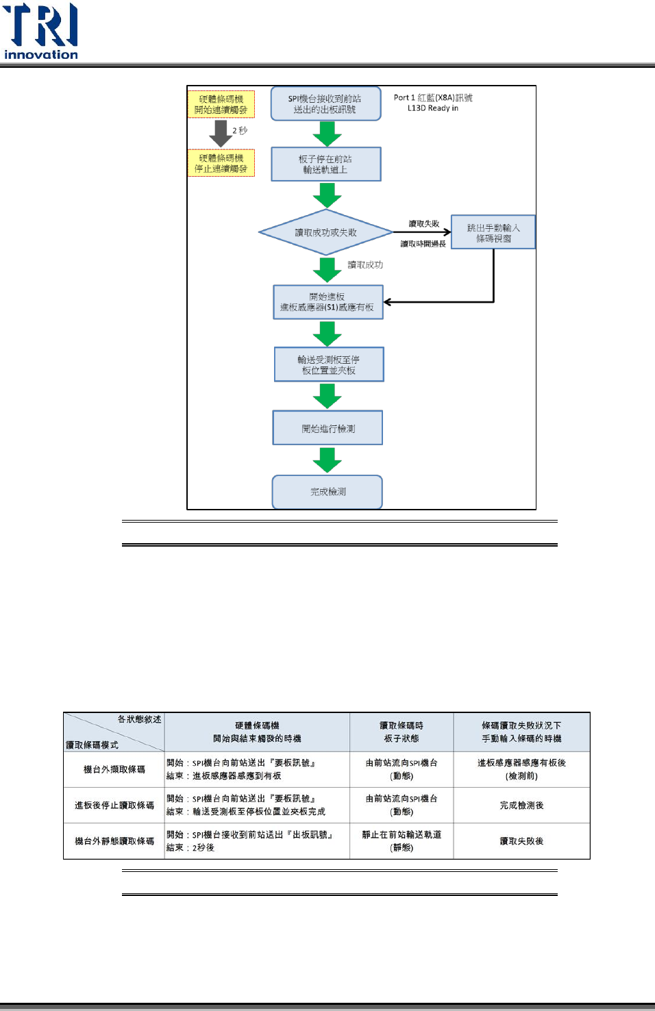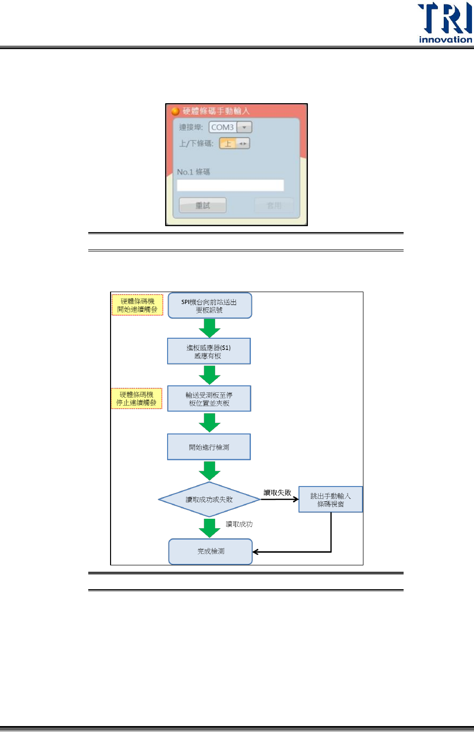 Test Research Inc. TR 7007 User Guide -- So ftware 155 跳出手動輸入條碼視窗 ( 如圖所示 ) ,完成輸入後受測板才會開始輸送至停板位 置開始檢測。 手動輸入條碼視窗 示意圖 圖 318 2. 進板後停止讀取條碼:流程圖如下所示。 進板後停止讀取條 碼流程圖 圖 319 硬體條碼機連續觸發開始與結束的時機: SPI 機台向前站送出『要板訊號』後 開始連續觸發,直到將受測板輸送到停板位…