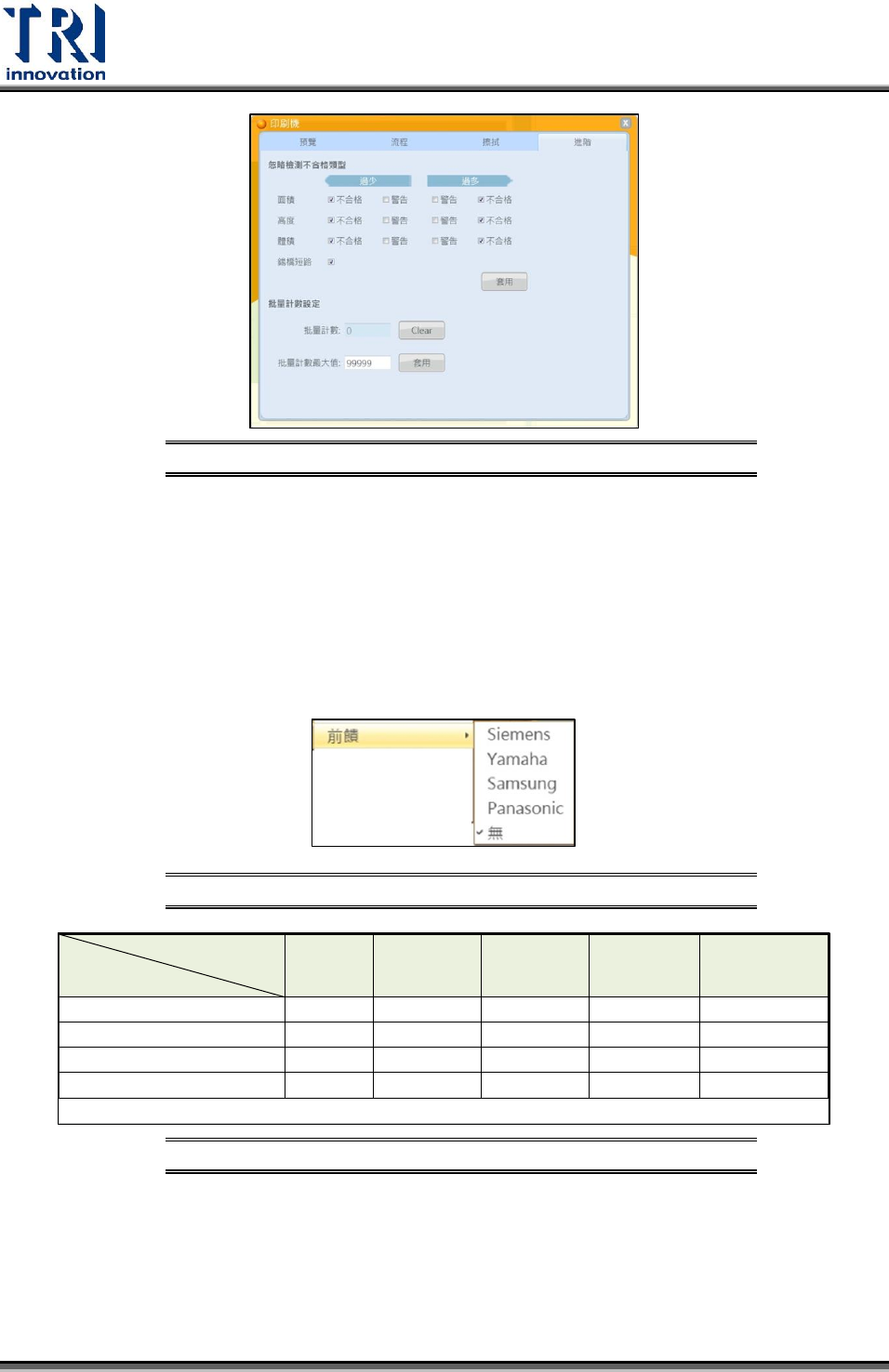 Test Research Inc. 164 TR 7007 User Guide -- So ftware 進階分頁的介面設 定示意圖 圖 338 a. 忽略檢測不合格類型:設定不納入整板錫膏偏移量運算的錫點。以圖中 面積為例,當面積値過少或過多 ( 超過標準値的上下限 ) 的錫點不會納入整 體錫膏偏移量的計算。 b. 批量計數設定:顯示當前檢測的片數並可設定該批的最大片數。 前饋:使用者設定對應的後站 ( 打件機 ) 廠牌,開啟功能…