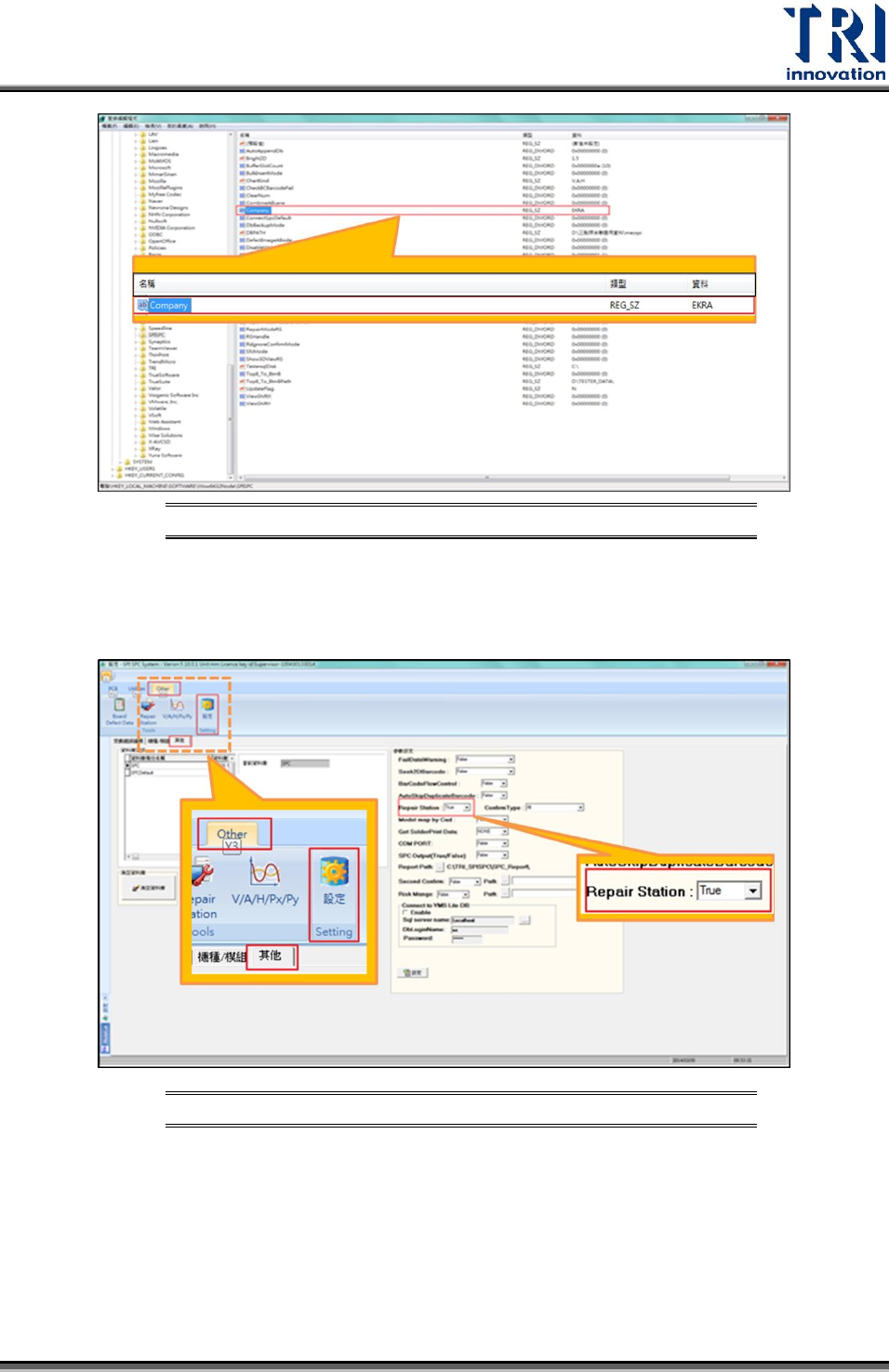 Test Research Inc. 168 TR 7007 User Guide -- So ftware 設定 Repair Station/Buf fer 與 SPI 連線 流程圖 圖 346 1. EKRA SPC 資料夾儲存路徑設定: a 點選 W i ndows 開始,於搜尋列中輸入路徑: OS 為 32 位元 HKEY_MACHINE\SOFTW ARE\SPISPC\ OS 為 64 位元 HKEY_MACHINE\SO…