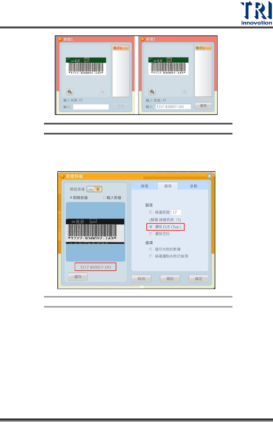 濾除(S/E Char.):勾選此選項後可將條碼資料中的前後資料字元。如下圖所
