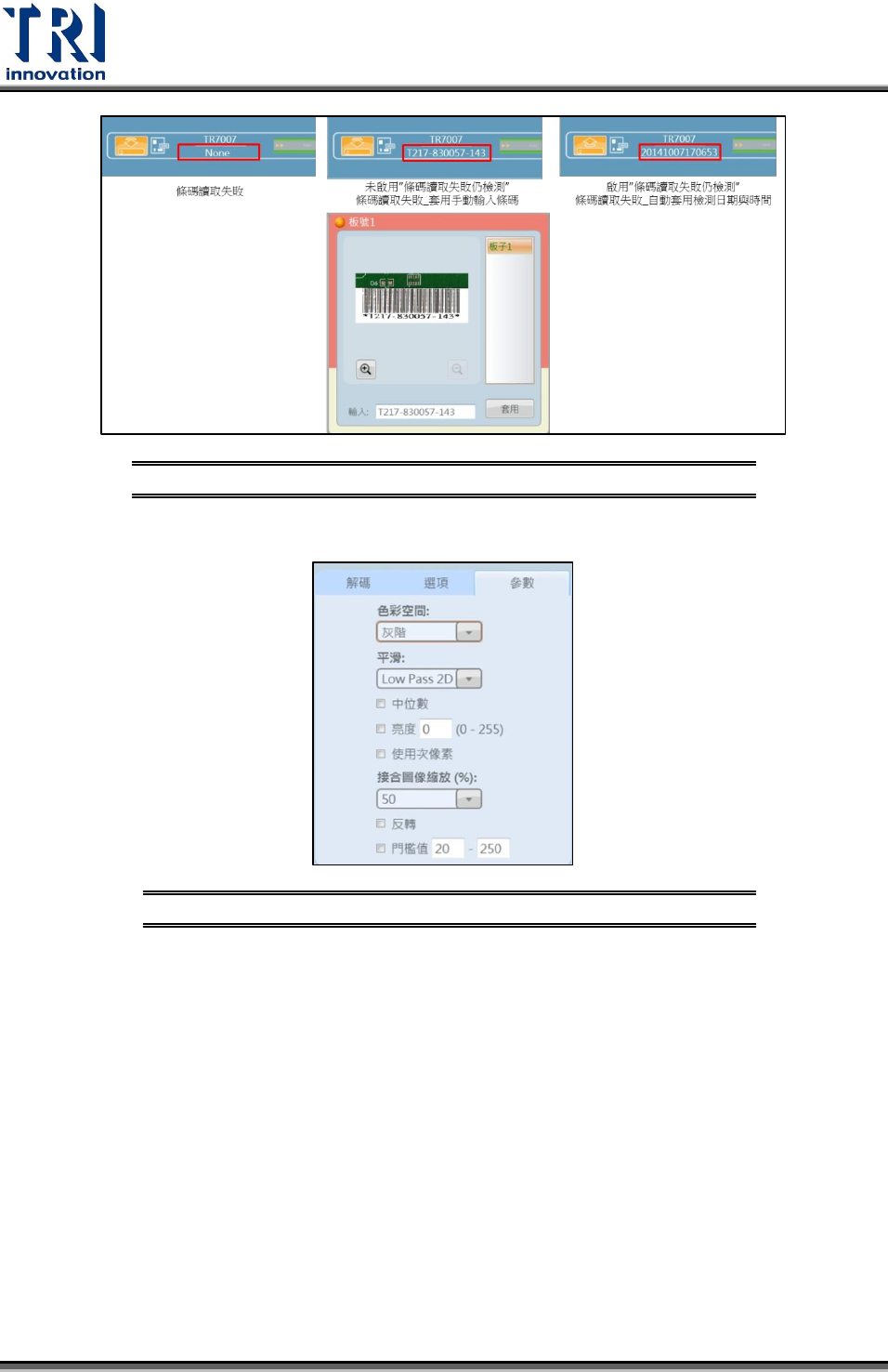 Test Research Inc. 44 TR 7007 User Guide -- So ftware 開啟與未開 啟條碼讀取 失敗仍檢測 功能的檢測狀態 列比較圖 圖 80 『參數』分頁下: 『參數 』分頁下介 面示意圖 圖 81 色彩空間:以灰階顯示條碼影像。 平滑處理:使用選單中的影像處理功能來去除雜訊。 Low pass 2 D :低通濾波濾除雜訊。 Gau ssian 3X3 : 3X3 矩陣以高斯平滑濾波濾除雜訊…