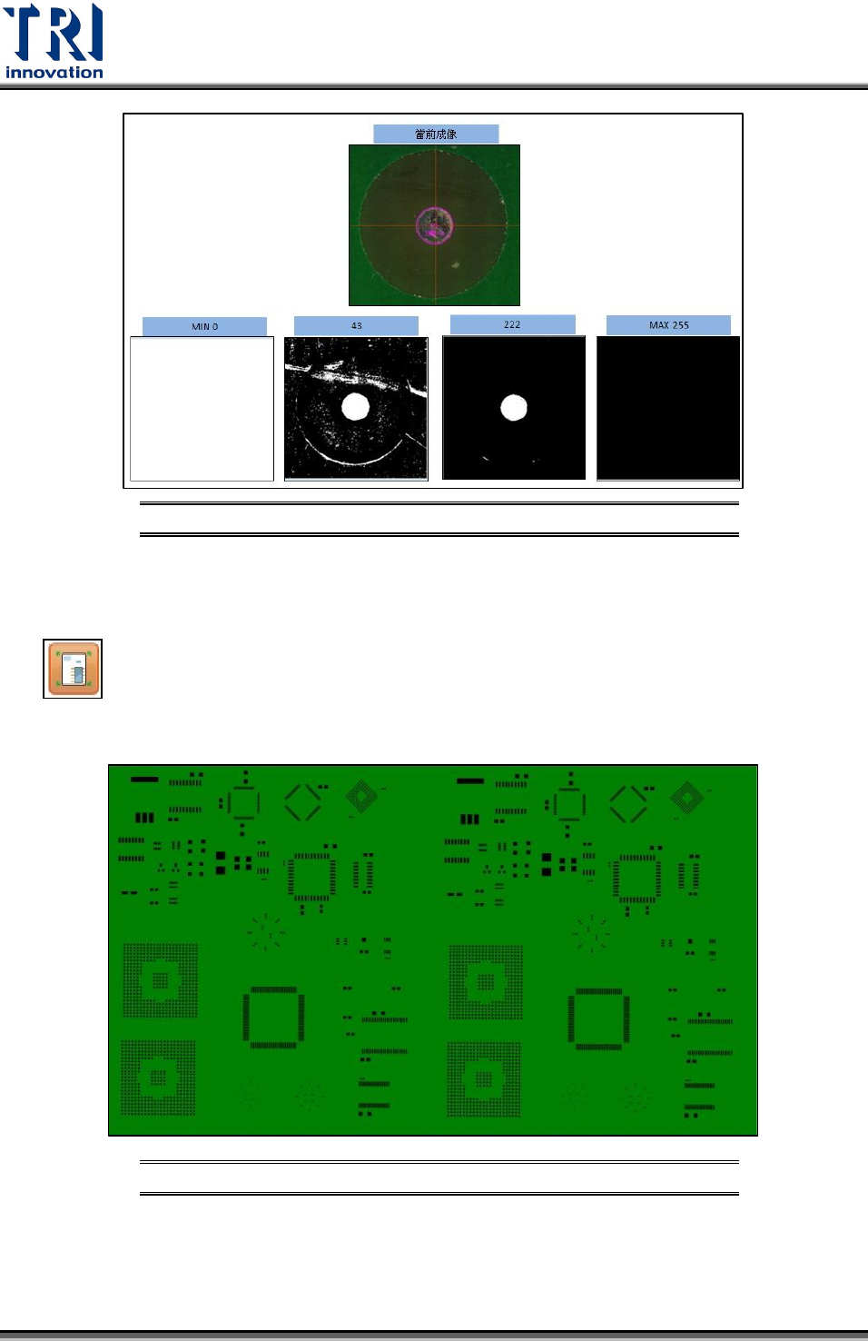Test Research Inc. TR 7007 User Guide -- So ftware 55 邊緣設定示意圖 圖 105 門檻值 (Th) :使用門檻值進行二值化,並將雜訊濾除。 程度:過濾小於門檻值設定的灰階值。 數值 (0~255) 愈大,代表被過濾的灰階值變多。 點選套用,可參考當前檢測的分數來判定設定是否為最佳化。