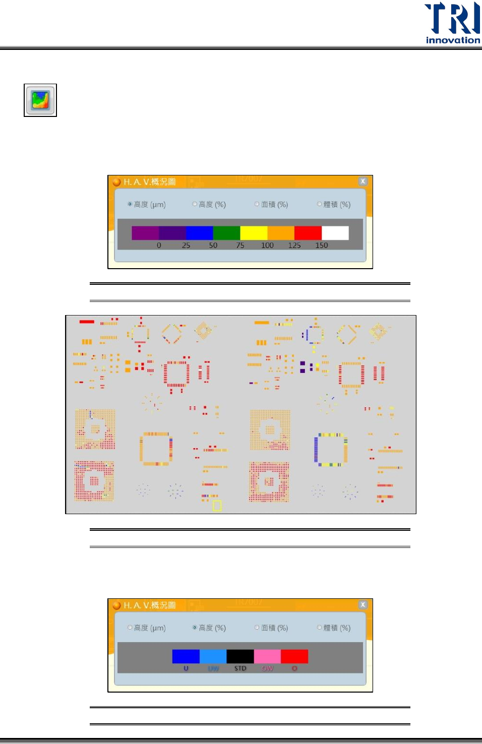 執行檢測後,將全板的高度/面積/體積用顏色等高圖的方式來呈現。方便