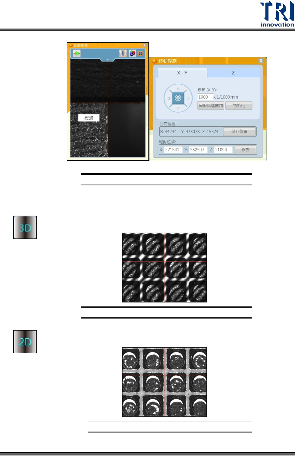 Test Research Inc. TR 7007 User Guide -- So ftware 63 移動控制介面 圖 120 3.10.2 即時影像 - 動態取相機型 3D 條紋光顯示模式 條紋光成像圖 圖 121 2D 白光顯示模式 白光成像圖 圖 122