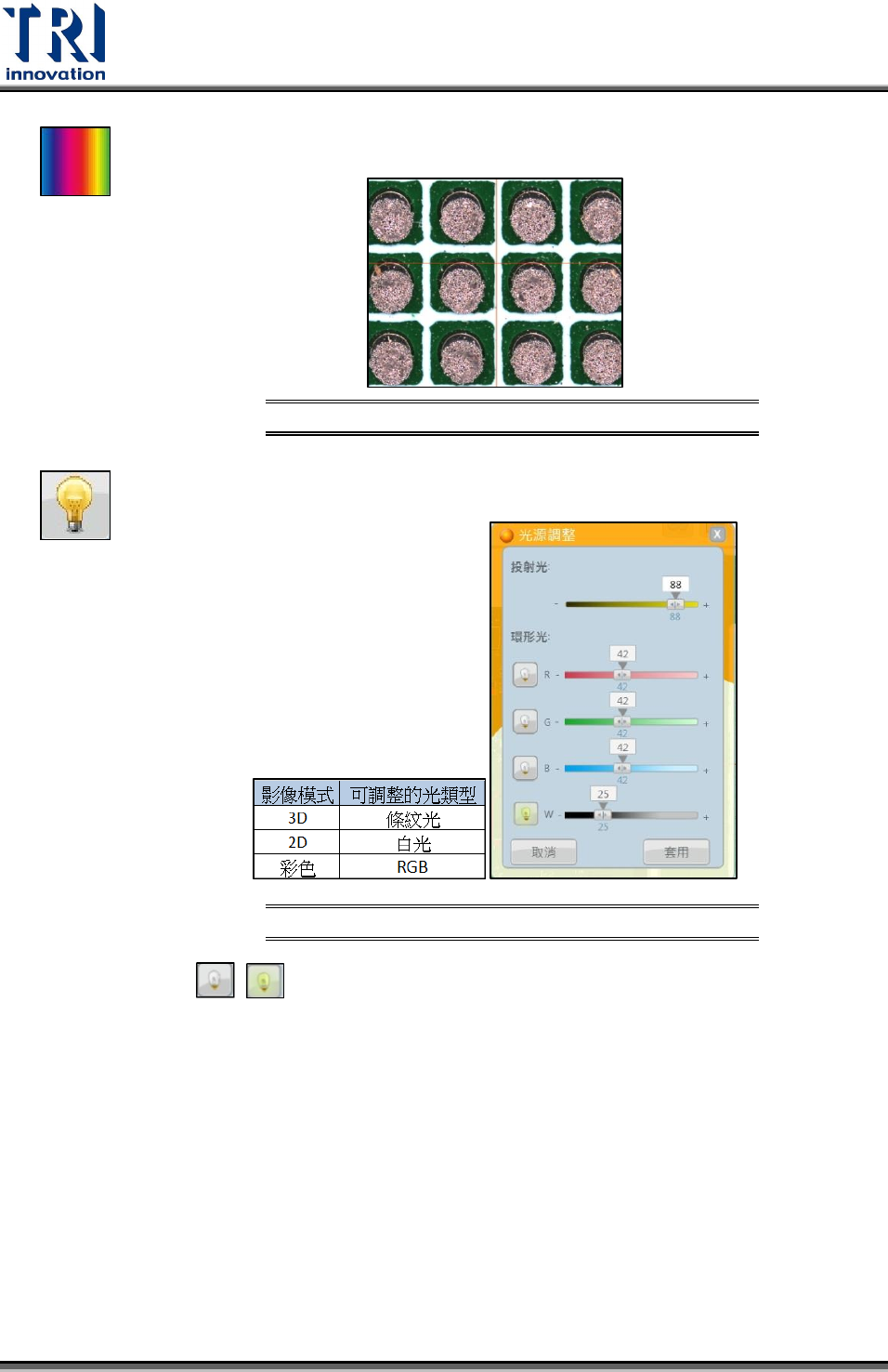 光源調整介面與各光源相對應的影像模式示意圖