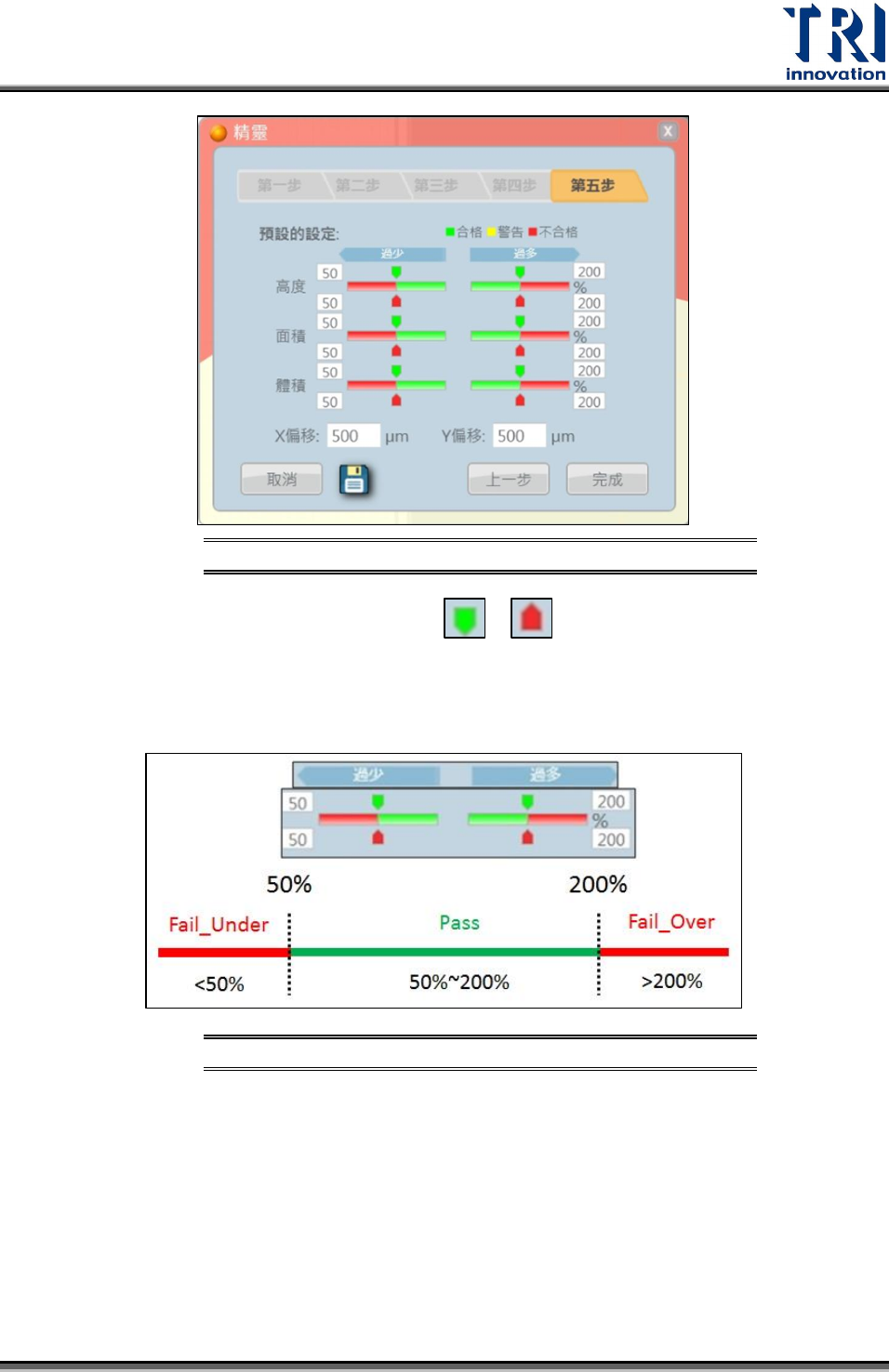 X/Y偏移量:實際錫膏位置與檢測框可允許的偏移量。