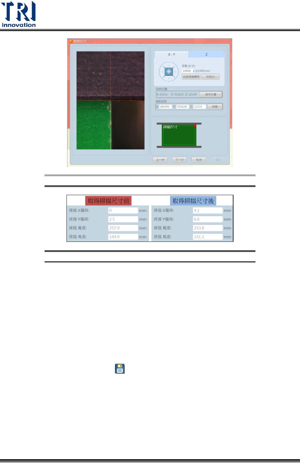 藉由”取得掃描尺寸”重新設定掃描 X 値。