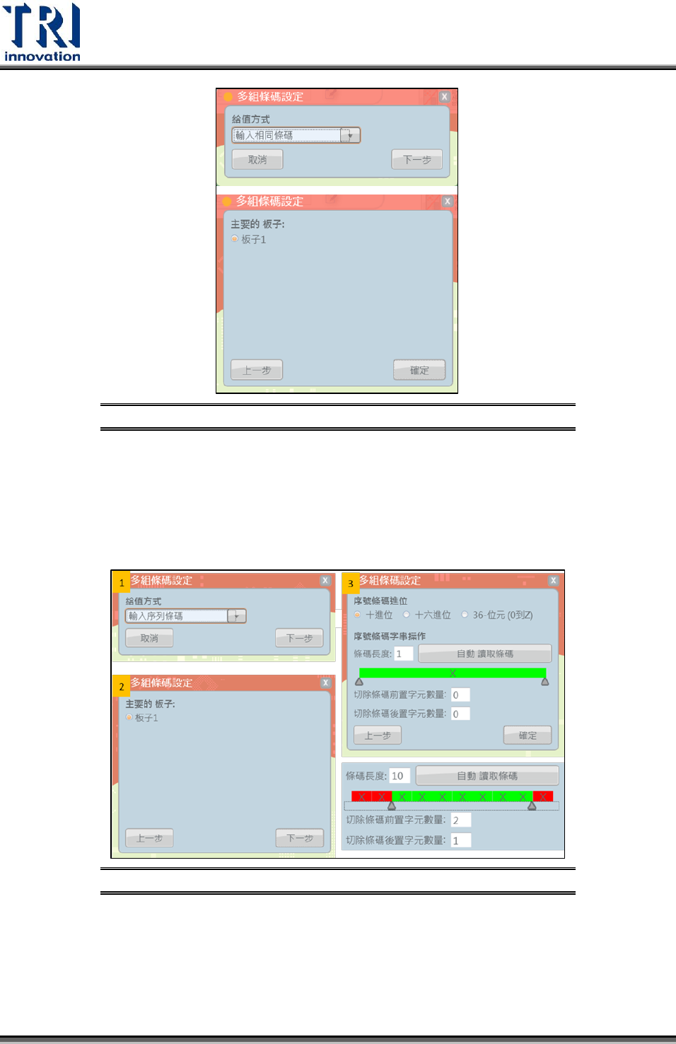 若要使板號 2 的條碼命名為 TRI1234568P,則設定切除條碼前 3 碼與後 1