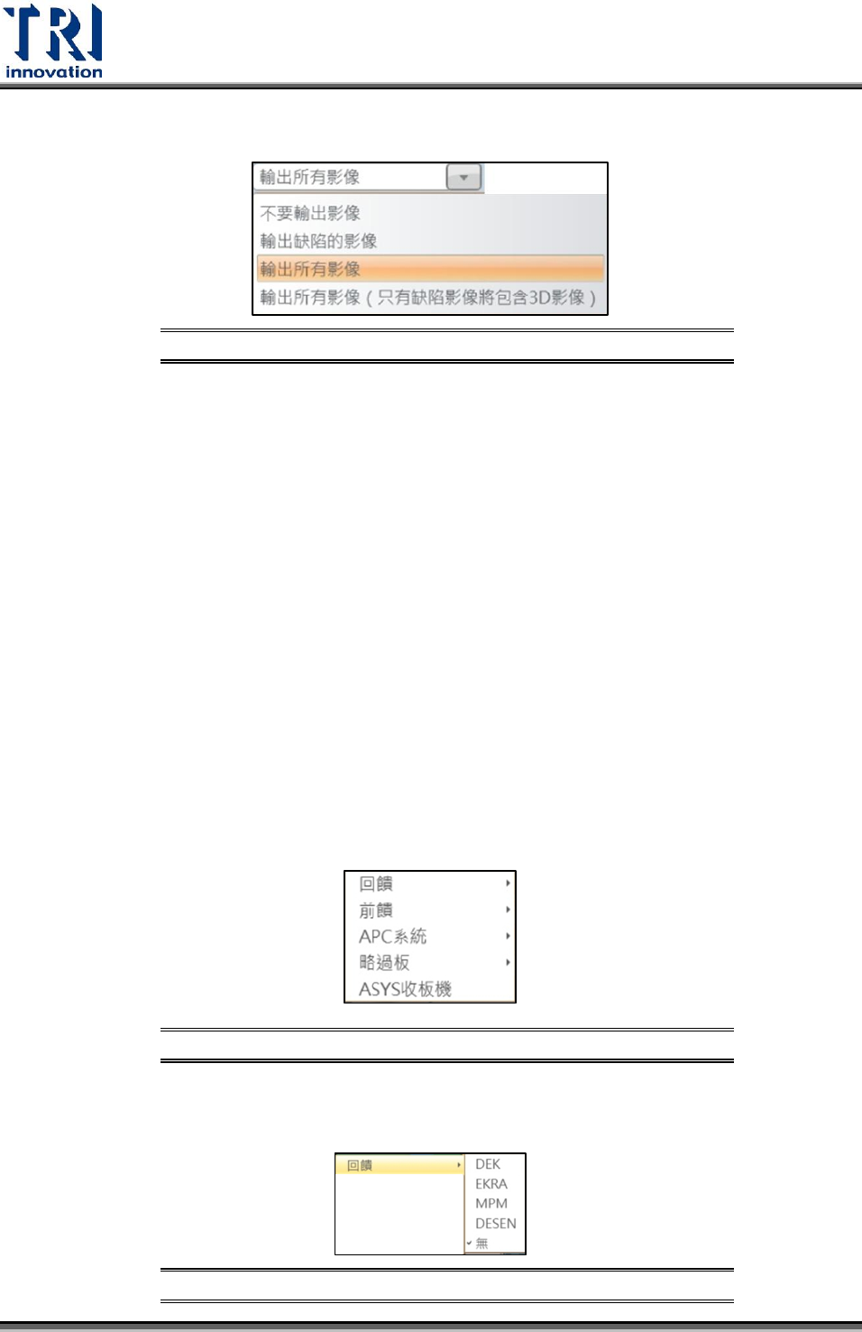 Test Research Inc. 160 TR 7007 User Guide -- So ftware 影像設定:設定輸出影像的種類。 影像設定選單示意 圖 圖 328 不要輸出影像:僅輸出檢測資料,不輸出影像。 輸出缺陷的影像:檢測資料中會包含輸出機台檢測出的缺點影像。 輸出所有影像:輸出所有檢測影像。 輸出所有影像 ( 只有缺陷影像將包含 3D 影像 ) :輸出所有 ( 包含 3D 影像 ) 檢測影 像 YMS…