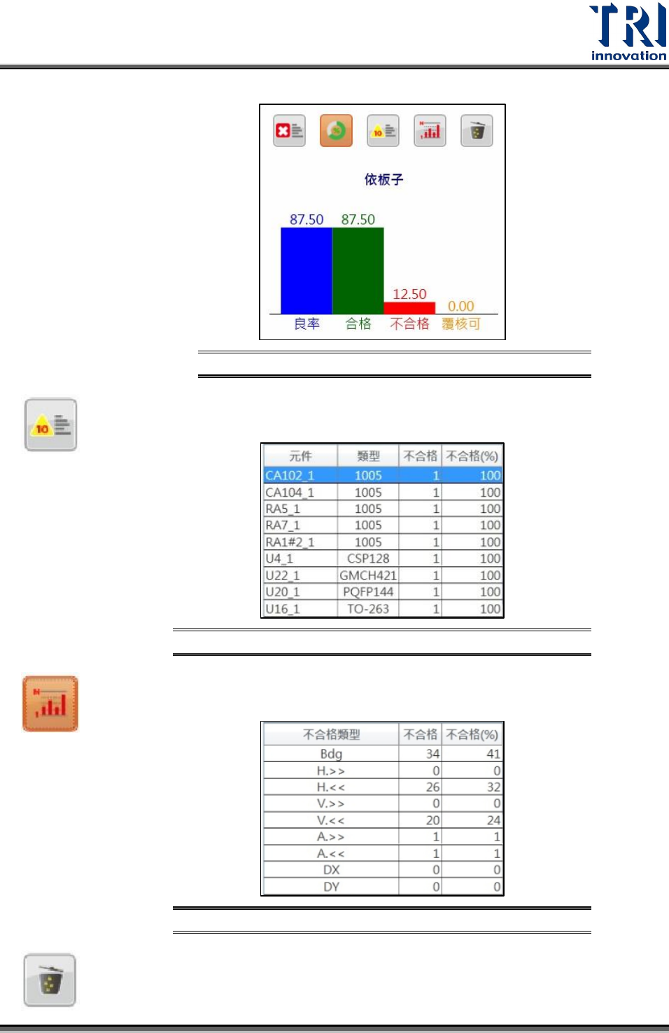 Test Research Inc. TR 7007 User Guide -- So ftware 19 合格 率直方圖 圖 22 前十項不合格項目:前 10 大不良的元件名稱與類型。 前十 項不合格項目示意 圖 圖 23 不合格型態統計:顯示 22 項缺點類型的缺點總數與百分比。 不合格 型態統計示意圖 圖 24 重置:清除當前結果列表。