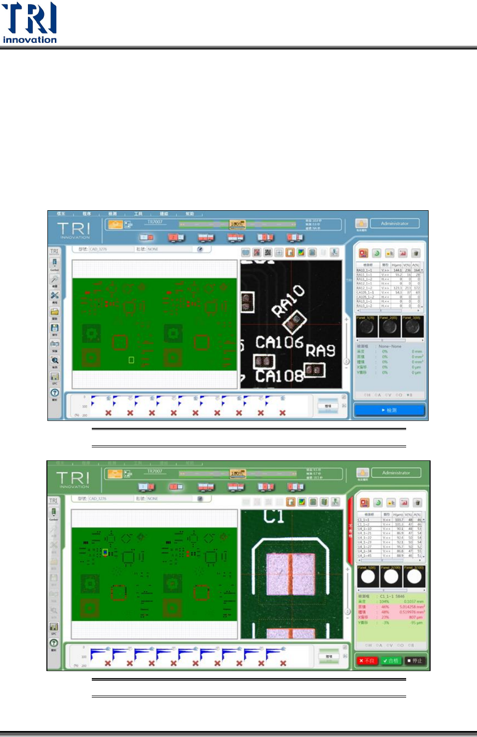 Test Research Inc. TR 7007 User Guide -- So ftware 27 兩軌的軟體介面可以選擇於各別螢幕單一顯示,或是在兩個螢幕上同時顯示。使用者 可於介面上的切換按鈕直接選定顯示方式。 切換雙 軌螢幕的排 列方式示意 圖 圖 41 2.2.1 同時顯示 _ 水平排列 同時顯 示 _ 垂直排 列示意圖 圖 42 上圖中對應的各區域如下 : 1. 切換排列方式:兩個介面皆有此功能列,並可選擇是否隱藏。 …